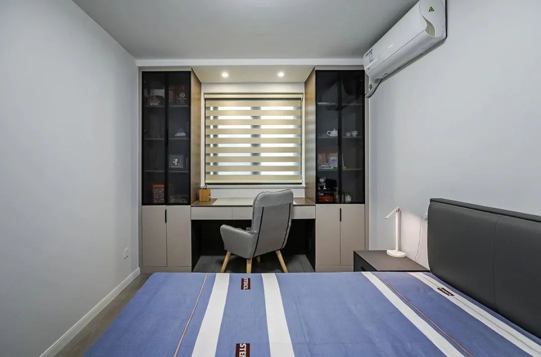 考慮到業主夫婦兒孫的探訪居住需求,我們特別定制寫字臺,寫字臺根據窗臺的造型打造,兩側打造了玻璃柜,不僅提供了充足的儲物空間,還增強了整個書房的視覺效果。