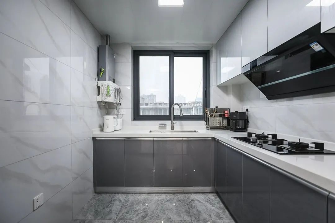 廚房的色調以黑白為主,線條簡潔,沒有過多的裝飾,整體看起來干凈利落。采用L型布局,水槽、切菜和烹飪區域均沿著一條直線或直角排列,不僅方便了操作,還最大化地節省了空間。另外,我們將廚房的窗戶大小開口到恰到好處,以保證充足的采光,增添了明亮感和舒適感。
