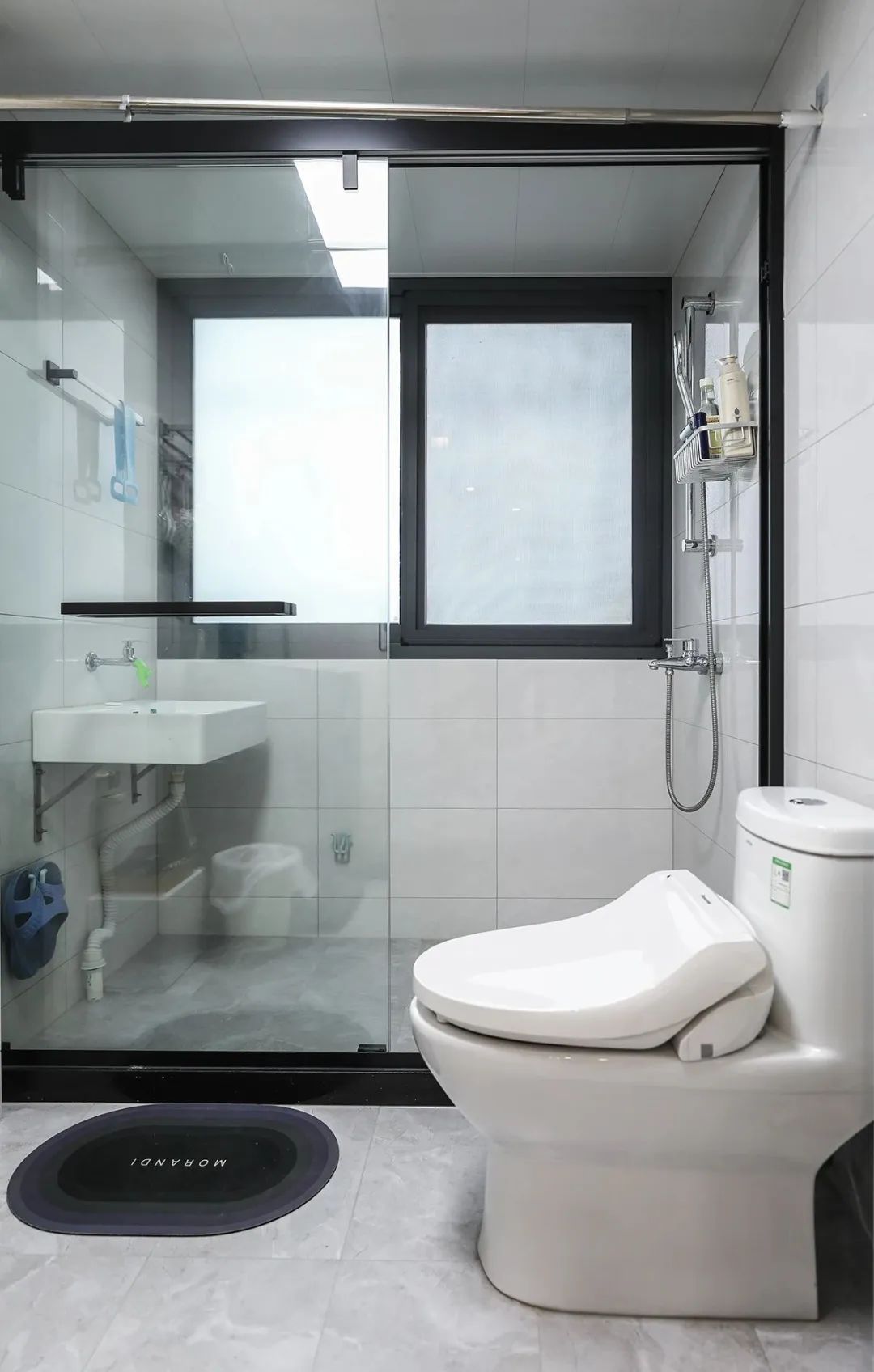 衛生間設計采用簡約而時尚的風格,整體色調以白色和灰色為主,追求清新整潔的感覺。淺灰色的墻磚與白色的馬桶和洗手臺相得益彰,增強了空間的層次感。