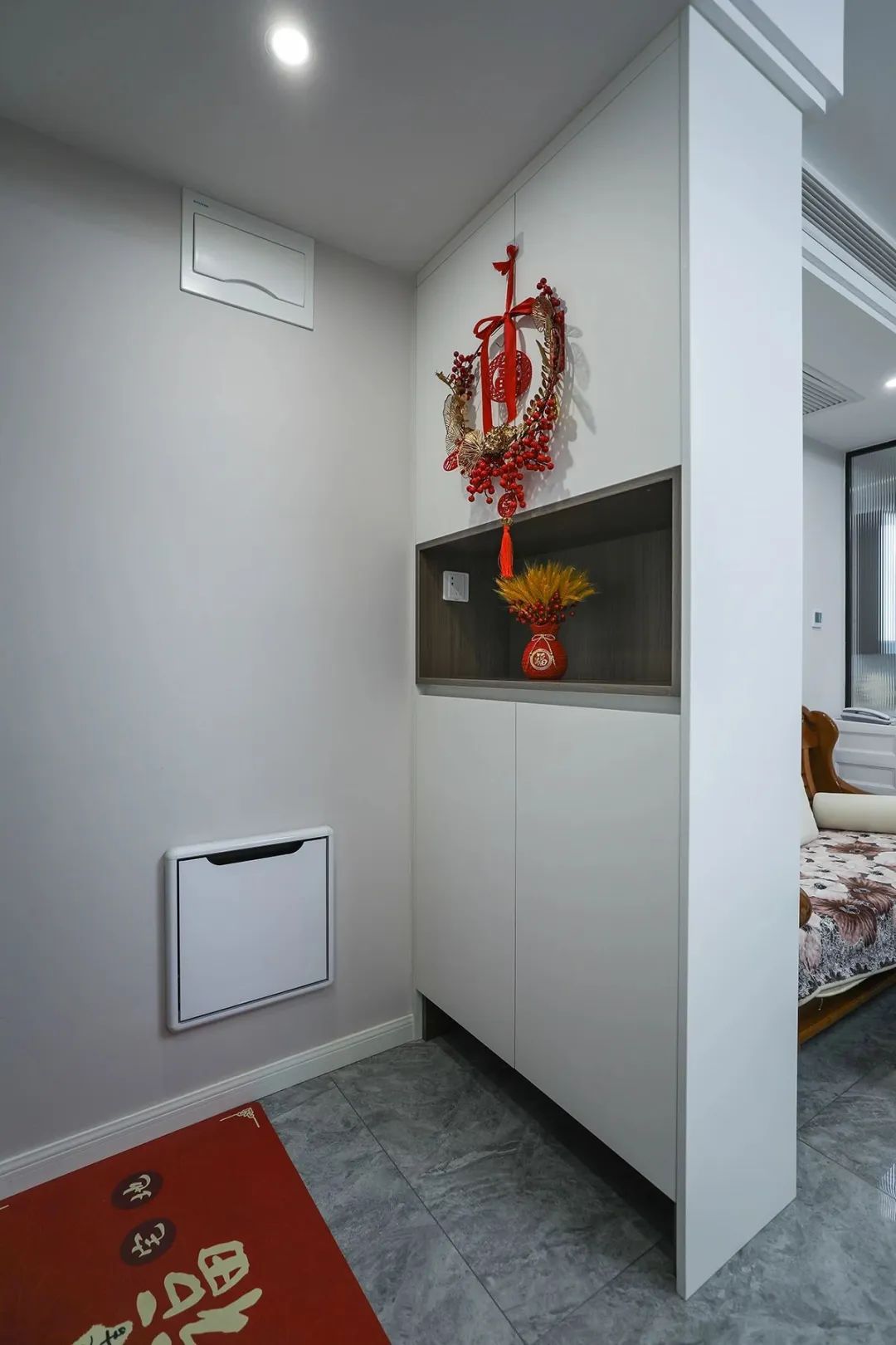 進門玄關位置,我們定制了玄關柜,避免了開門即看到客廳內部的情況,確保了私密性和距離感。定制柜中間鏤空做了一個可以放置鑰匙、包包等小物件的平臺,方便業主日常生活進出拿取放置。我們還特意在柜子的上方懸掛了中國結和裝飾品,這種布局方式突出了紅色元素,為空間增添了藝術感和層次感。