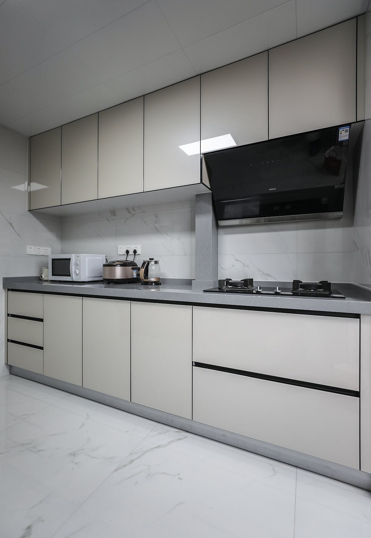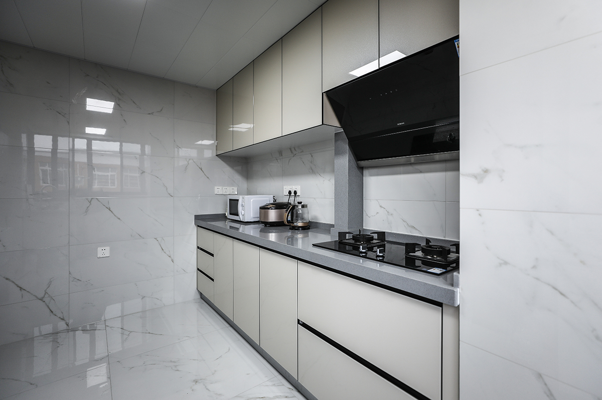 該套房子廚房空間很大,L型兩面櫥柜,另外冰箱邊上也有操作臺,顏色簡潔明快,材質(zhì)要干凈和好打理,白色的吊頂和米色的櫥柜相呼應(yīng),各種廚房電器全部。