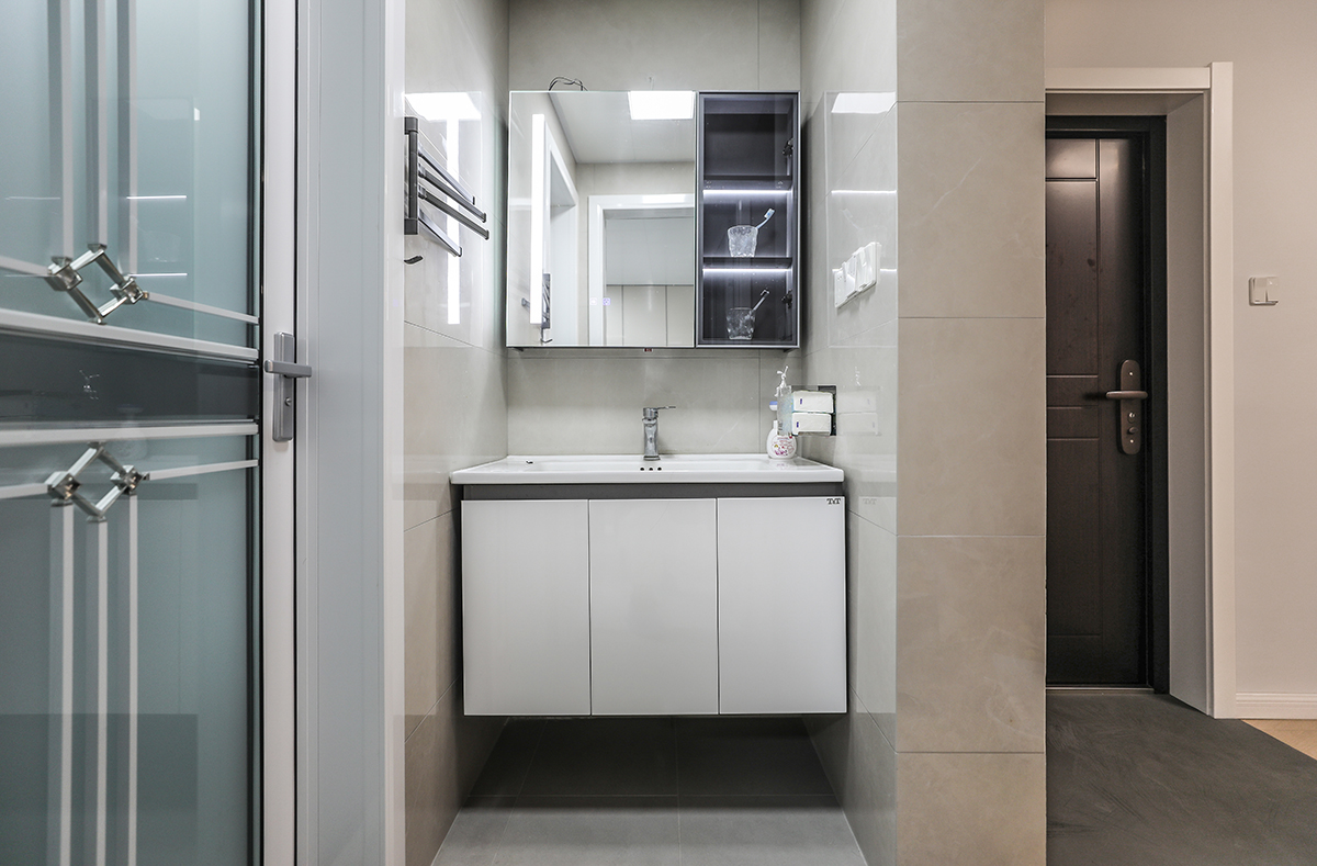 衛(wèi)生間干濕分離,干區(qū)放置90公分洗臉盆,簡潔實用。