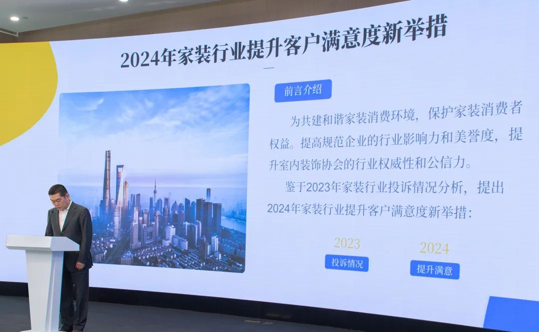 發(fā)布會上,《2023年家裝行業(yè)投訴及處理情況分析報告》和《2024年家裝行業(yè)提升客戶滿意度新舉措》發(fā)布。上海室內裝飾行業(yè)協(xié)會會長徐國儉介紹2024年協(xié)會將推出的五項新舉措,全力提升行業(yè)服務水平和消費者滿意度,推動家裝行業(yè)健康發(fā)展。