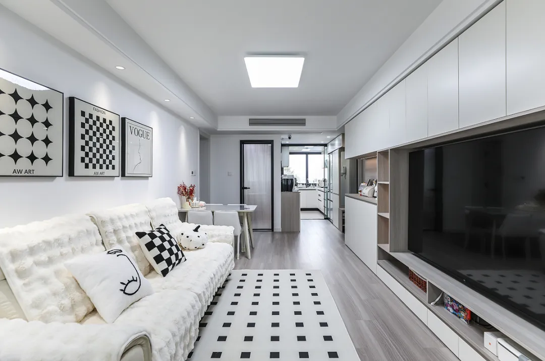 該設計采用現(xiàn)代簡約之爆火奶油風,奶油色作為整體的主色調(diào),被運用在墻面和天花板上,搭配淺木色地板,營造出一種溫馨舒適的氛圍。白色布藝沙發(fā)與白灰色電視柜相互呼應,簡約而不失質(zhì)感。我們還巧妙地融入了一些棋盤格元素,打造出一個既溫暖又充滿時尚感的休閑空間。
