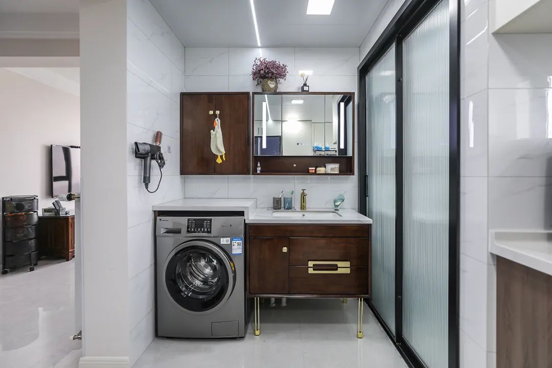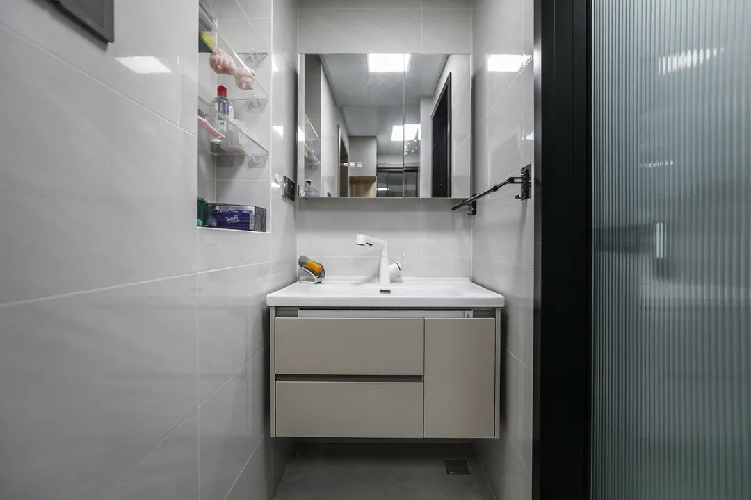 在該衛生間設計中,我們采用干濕分離的布局,配備了90公分的壁掛洗手臺和鏡柜,這樣不僅優化了儲物空間,也提升了整體的美觀度。這一設計充分考慮了客戶在早晨高峰時段對廁所和洗漱設施的雙重需求,確保了高效與舒適并重。