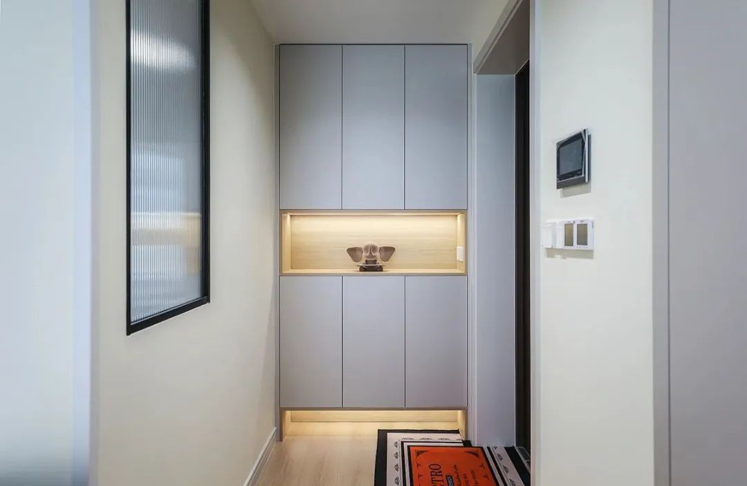 該套房我們為客戶精心打造個性化入戶玄關,鞋柜巧妙地劃分為四個功能區:底部寬敞的鞋履存放空間,便于整理和取用;中間開放式展示架,可供業主展示收藏或裝飾品;頂部則為實用的儲物空間,適合放置季節性物品;側邊特設掛衣區,輕松掛放外套和大衣,保持玄關整潔。