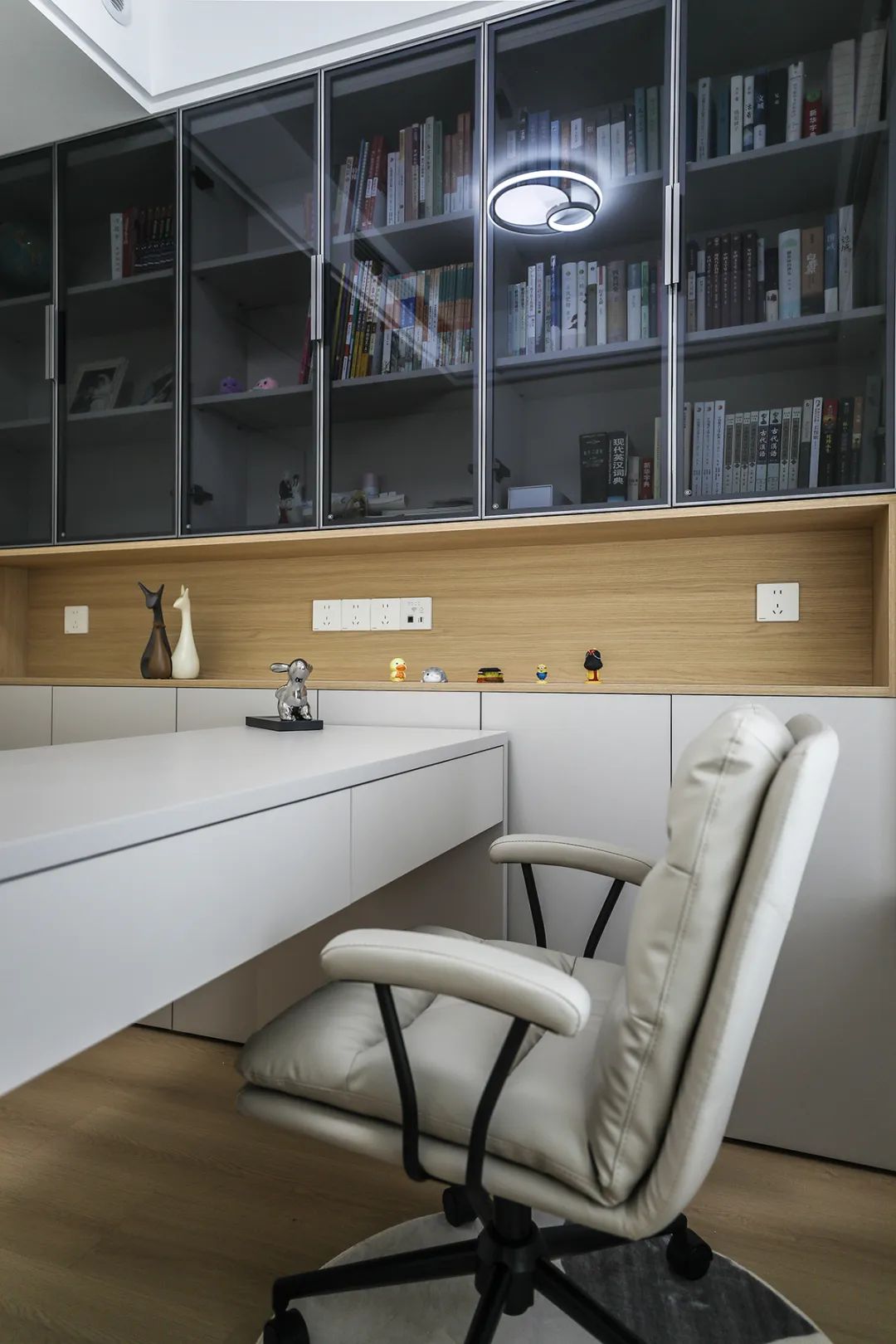 為了滿足業主居家辦公、閱讀的需求,我們特地通過拆墻改造格局的方式,為業主書房做出大面積書房空間。并在空間內布局了整面墻書柜、創意設計書桌。書柜柜體分上中下三層設計,可以非常明晰的做空間規劃和物品、書籍、展示品分類。