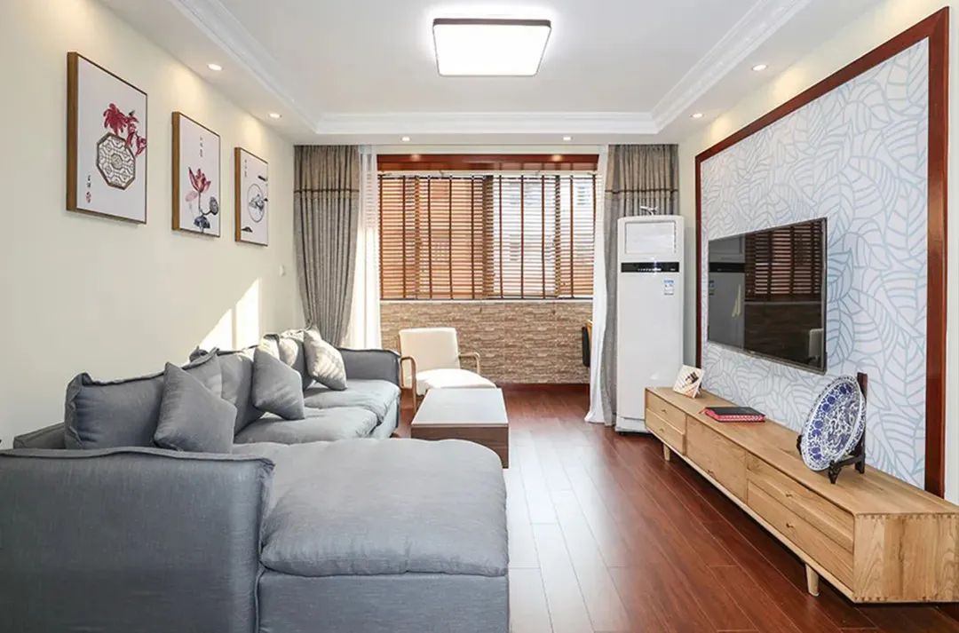 這個客廳案例結合了古典和新中式的元素,形成了一種獨特的混搭風格。空間中既有復古的實木家具和裝飾畫,又有現代的墻壁顏色和燈光設計。這種風格讓人感覺既古老又新鮮,充滿了層次感和變化。