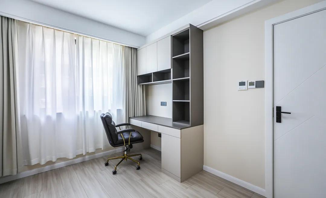 使用墻面安裝的書架來(lái)存放書籍和辦公用品,同時(shí)增加空間層次感。對(duì)于有一定空間和預(yù)算的家庭,柜墻辦公區(qū)是一個(gè)不錯(cuò)的選擇:
