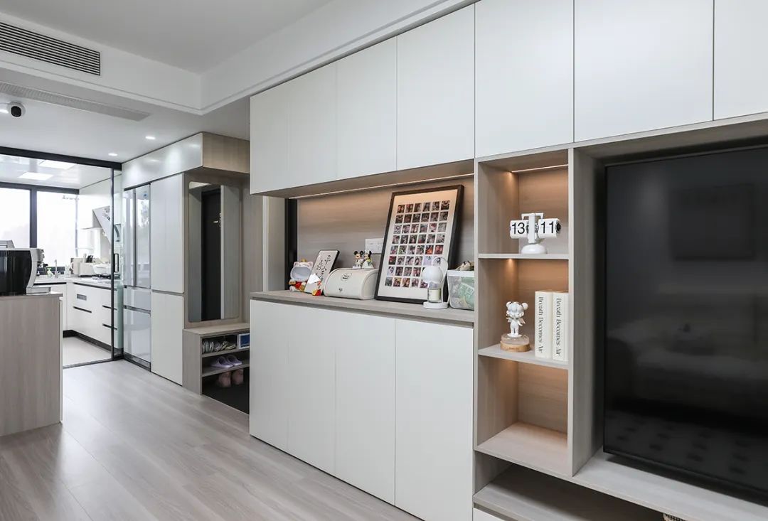 進門玄關(guān)處我們做了鞋子收納柜,柜體裝有化妝鏡,滿足上班出行美妝需求。旁邊餐邊柜半開放設(shè)計很方便放置進出門的鑰匙包包等物品。
