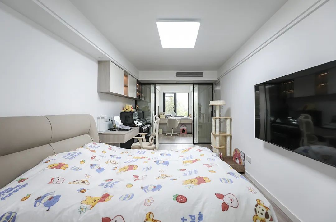 次臥整個打通做衣帽間和女主人辦公、化妝區(qū),解決了衣柜儲物空間,工作之余抬頭就是北面綠植,很溫馨,舒適、給人感覺不僅雅致而且有韻味。