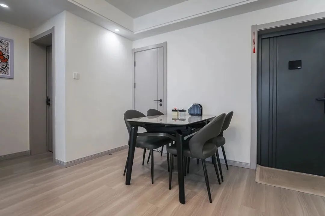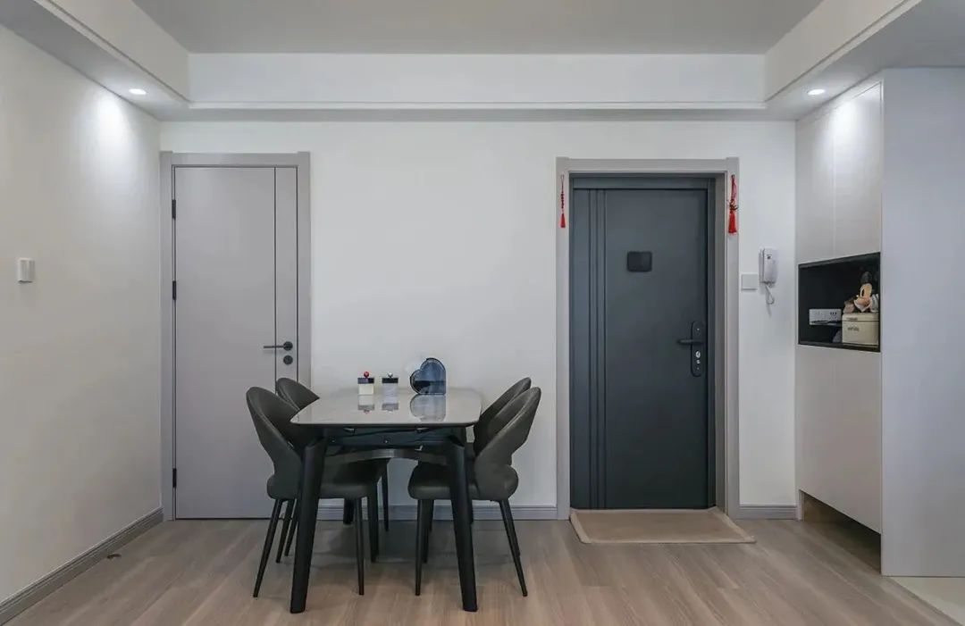 由于該套房建筑設計原因,原有餐廳區域比較尷尬,處在入戶門角落而且是臥室拐角處,”大而顯窄“。我們通過將餐廳后移,利用一部分空間改造出一個儲物間,這樣一來不僅有了單獨的收納空間,而且餐廳與客廳一體貫通,顯得通透美觀。