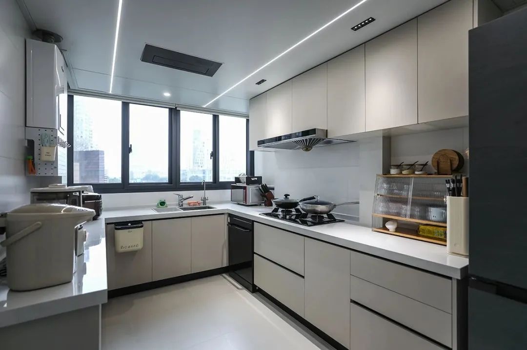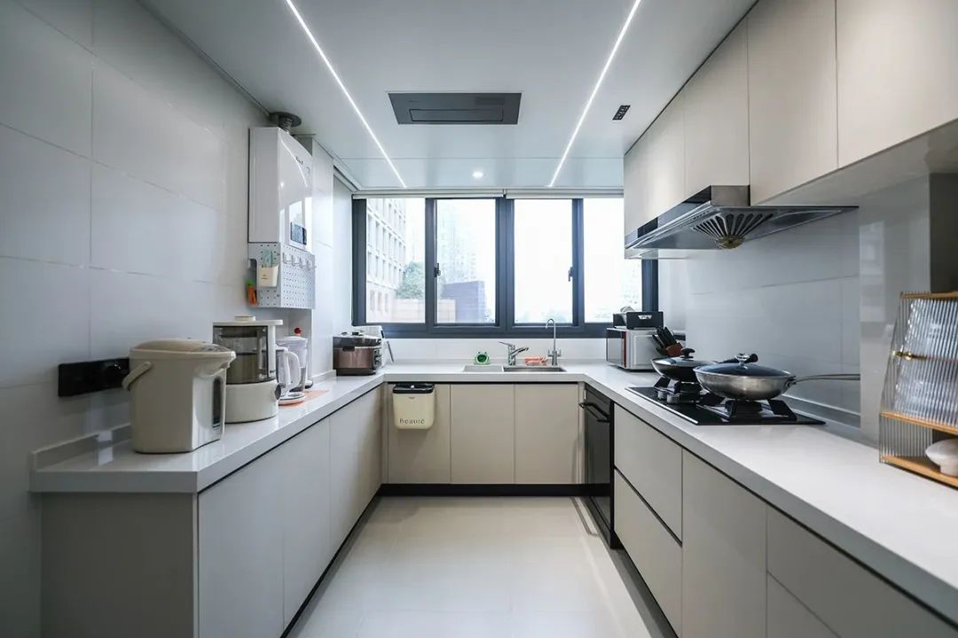 廚房區域我們采用了U字型廚柜,這種設計能夠讓取、洗、切、炒、擺的烹飪流程更流暢高效。釉白色柜身增添家居質感,白色臺面美觀、耐用、易于打理。