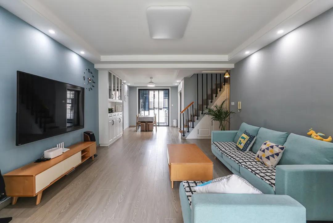 本案例以現代簡約風格為主,灰色和白色為基調,搭配深色沙發無主燈設計,簡潔大方,為家人打造了一個健康舒適的居住環境。