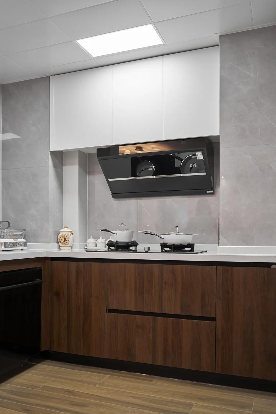 廚房白色臺面與深色木質(zhì)櫥柜相映成趣,為廚房增添了層次感和空間感。淺色大理石墻面則帶來了清新明亮的視覺體驗。嵌入式照明設(shè)備確保了廚房光線充足,方便日常烹飪。