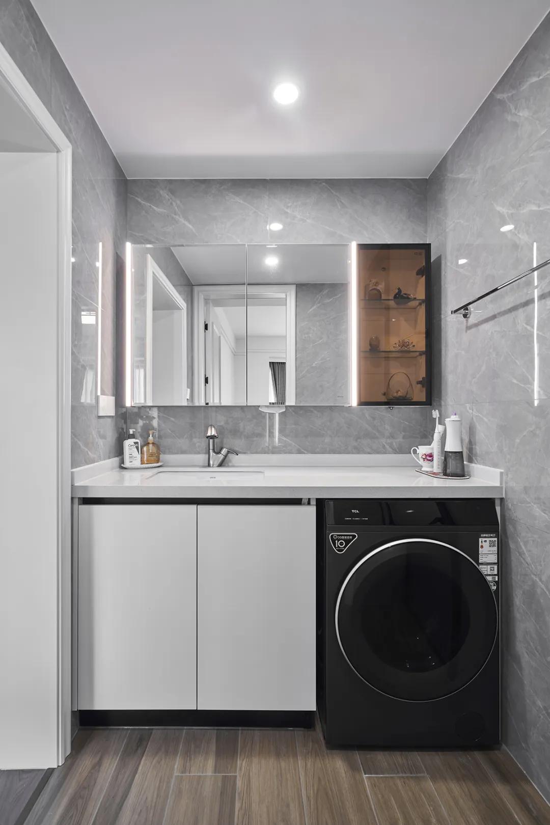 廚房灰色大理石臺面營造出典雅的氛圍,白色櫥柜與黑色洗衣機形成鮮明對比,凸顯了空間的層次感。特別是洗手池與上方的嵌入式化妝鏡設(shè)計,不僅實用,還增添了浴室的精致感。