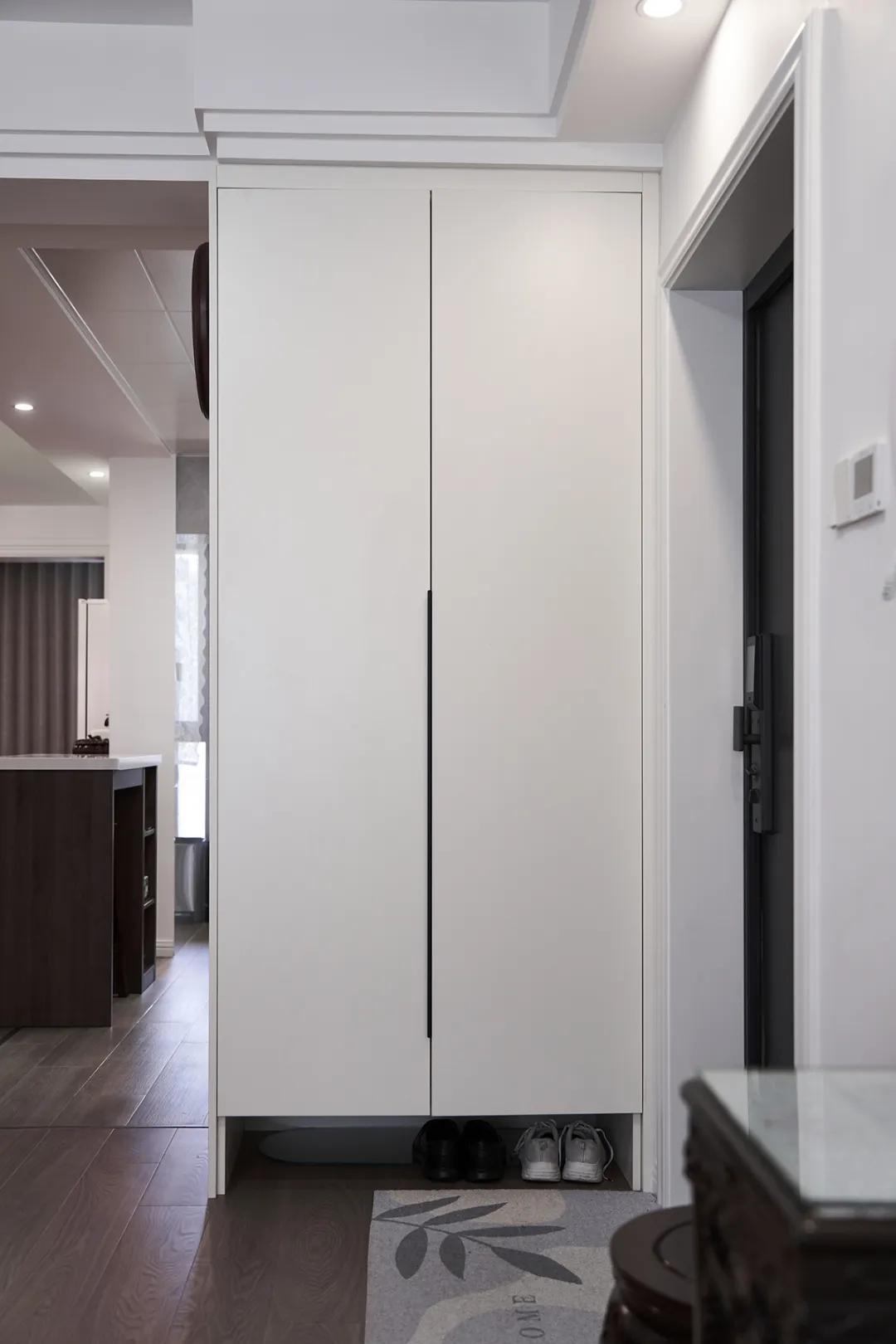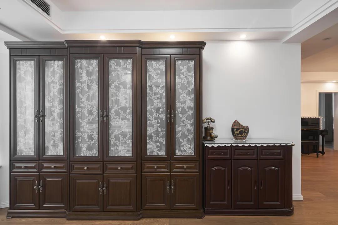 玄關(guān)區(qū)域以深棕色木質(zhì)衣柜為主,門上的白色蕾絲圖案增添了優(yōu)雅氣息。旁邊的木質(zhì)小柜子以及復(fù)古電話,都透露出一種精致的古典美。整個空間與白色墻壁形成鮮明對比,營造了一種溫馨而優(yōu)雅的氛圍。