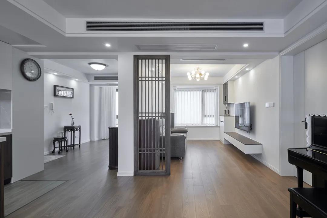 該套房業主為55歲左右的夫婦,我將將客廳以白色和灰調為主調,搭配黑釉色家具和裝飾品,凸顯出簡約而不失格調的設計感。木制隔斷上的中國傳統圖案,為空間增添了一抹文化韻味。復古吊燈和深色木地板的加入,不僅提升了空間的溫馨感,還給空間帶來更多細節。