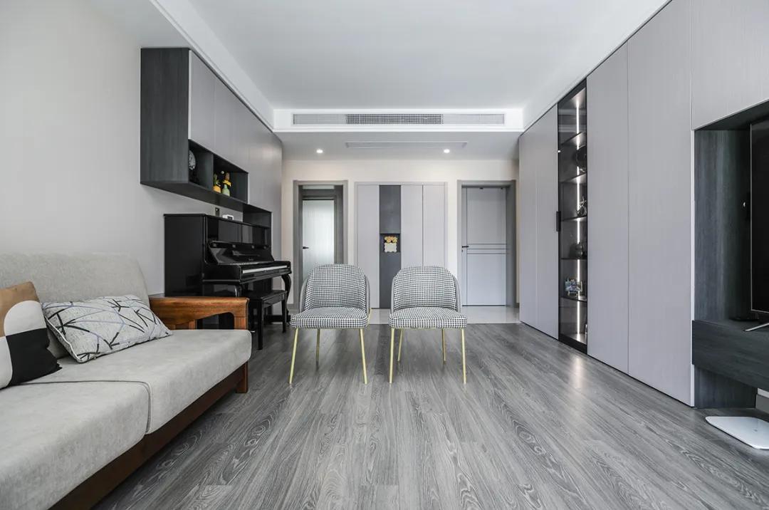 該居室主人夫妻倆都是青年成功人士,我們將客廳以白色和灰色為主調,設計師在客廳點綴式放了一些花卉,讓整個空間更加自然、舒適。此外,為了增加儲物空間,設計師在墻面上設置了一整面的嵌入式儲物柜,同時將鋼琴嵌入式柜子,使整個客廳更加整潔、實用。