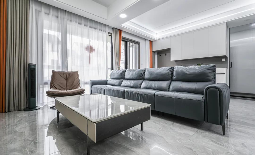 此現(xiàn)代風(fēng)格客廳,以黑橙撞色家具搭配白色大理石茶幾,展現(xiàn)出獨特的個性與品味。陶瓷大板作為地板,其灰色調(diào)將與現(xiàn)有裝飾完美融合,提升整體空間的顏值與檔次。