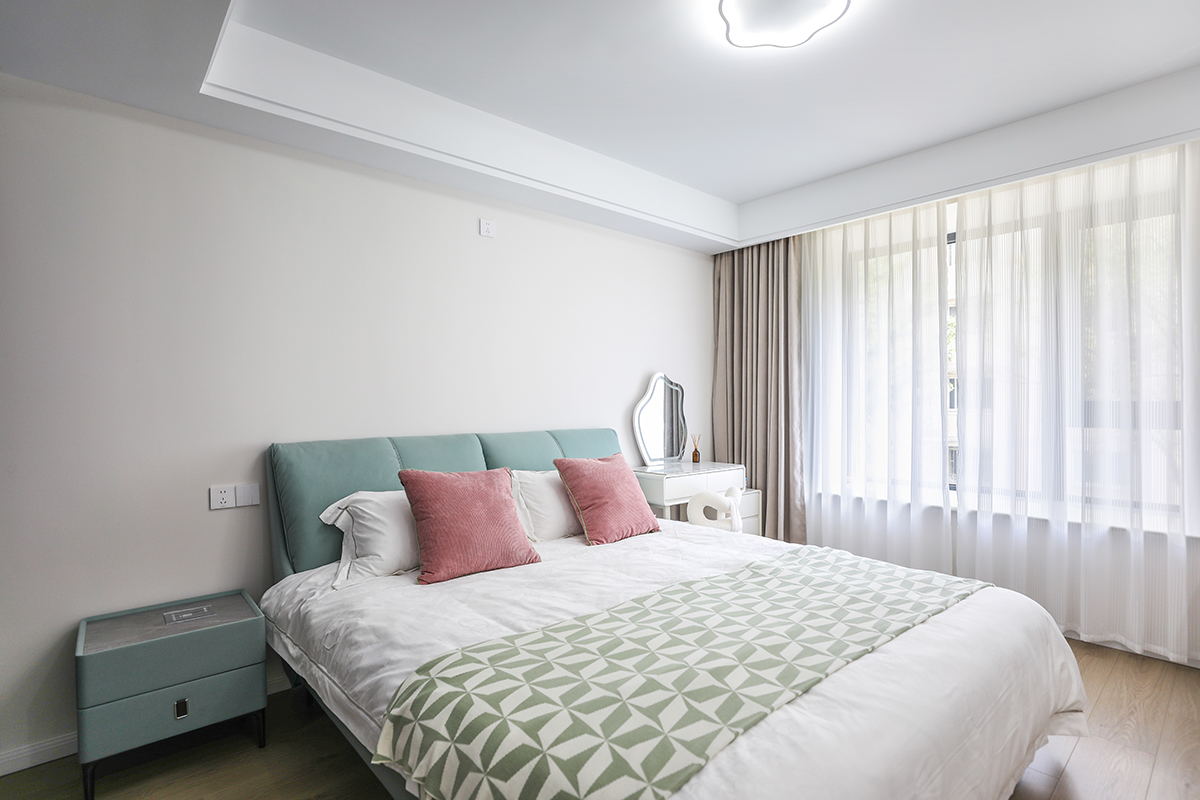 這張現代風格的臥室圖片以白色墻面與深木色地板為基底,營造出簡潔而明亮的視覺效果。梳妝臺上的圓形鏡子與化妝品擺放有序,、窗簾的顏色與床單相呼應,增強了空間的色彩連貫性。這個臥室設計注重實用與美觀的結合,為客戶創造了一個舒適、宜人的居住環境。