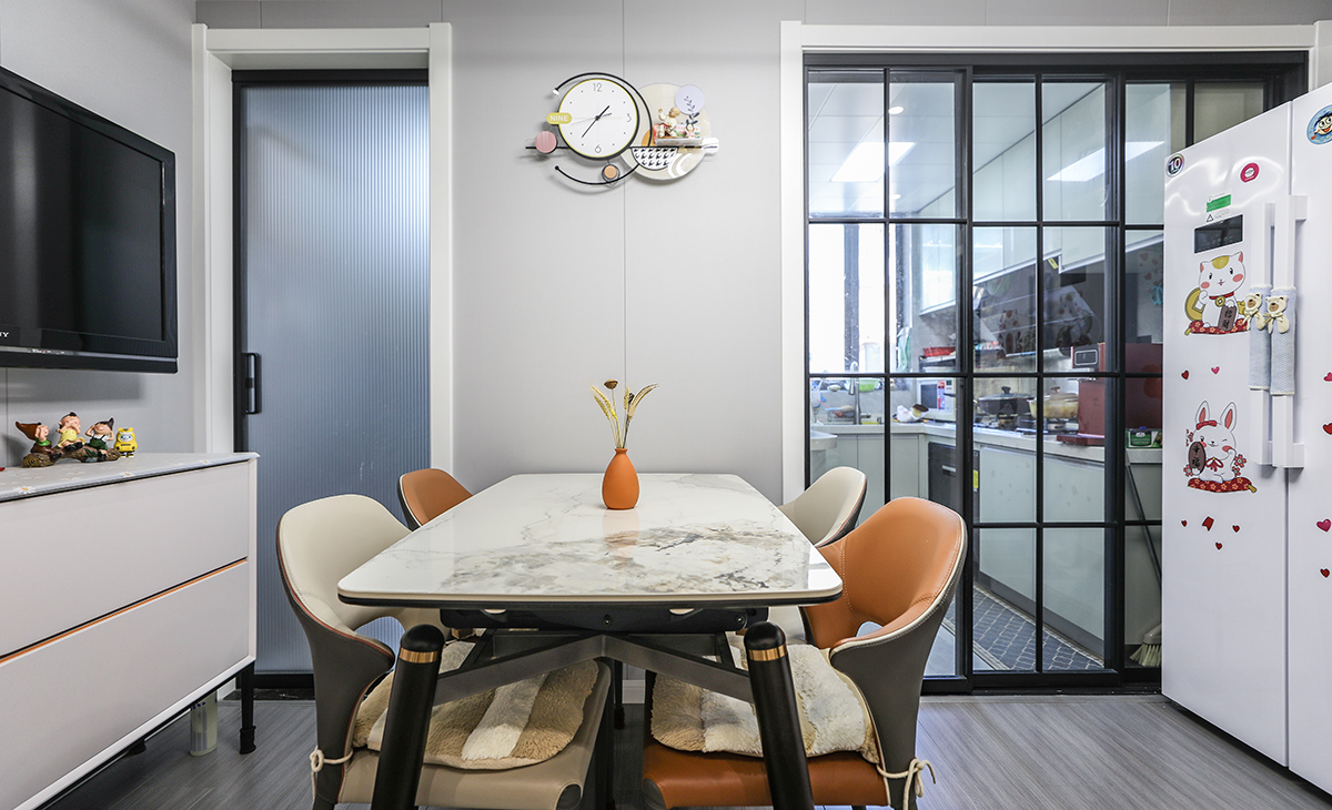 該案例廚房與餐廳的流暢銜接彰顯空間感。餐廳色彩以白色為主調,搭配橙色花瓶作為點睛之筆,增添活力與溫馨。軟裝方面,多彩椅子與家具家電搭配和諧,不僅美化空間,更賦予生活趣味性。