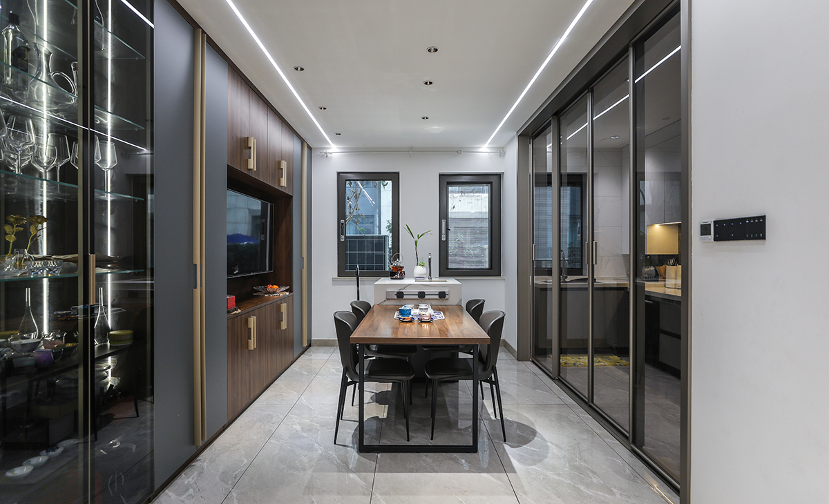 該餐廳白色與灰色櫥柜搭配黑色把手,展現出高級質感。餐桌與椅子則選擇了經典的白色與棕色組合,色彩和諧統一,營造出用餐的舒適氛圍。該餐廳空間明亮開闊,適合各種戶型。