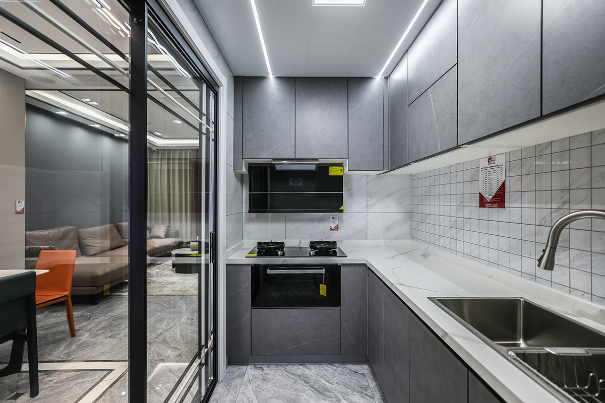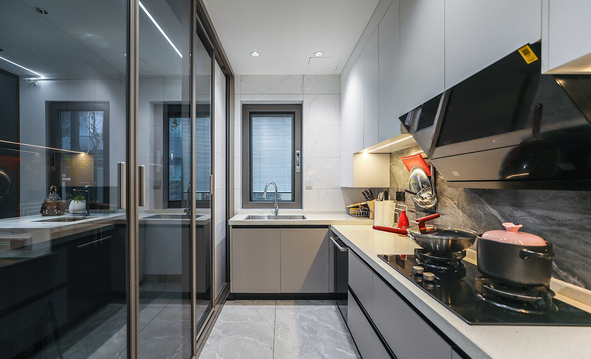 該廚房展現了現代簡約風格的精髓,灰色與白色的基調搭配不銹鋼材質,營造出一種清新、明亮的烹飪環境。特別值得一提的是,廚房與休息區之間的玻璃門隔斷,不僅巧妙地劃分了空間,還極大地增強了室內外的通透感。這樣的設計不僅提升了家居的整體美感,還讓小戶型空間顯得更加通透、靈活,為居住者帶來了更加愉悅的生活體驗。