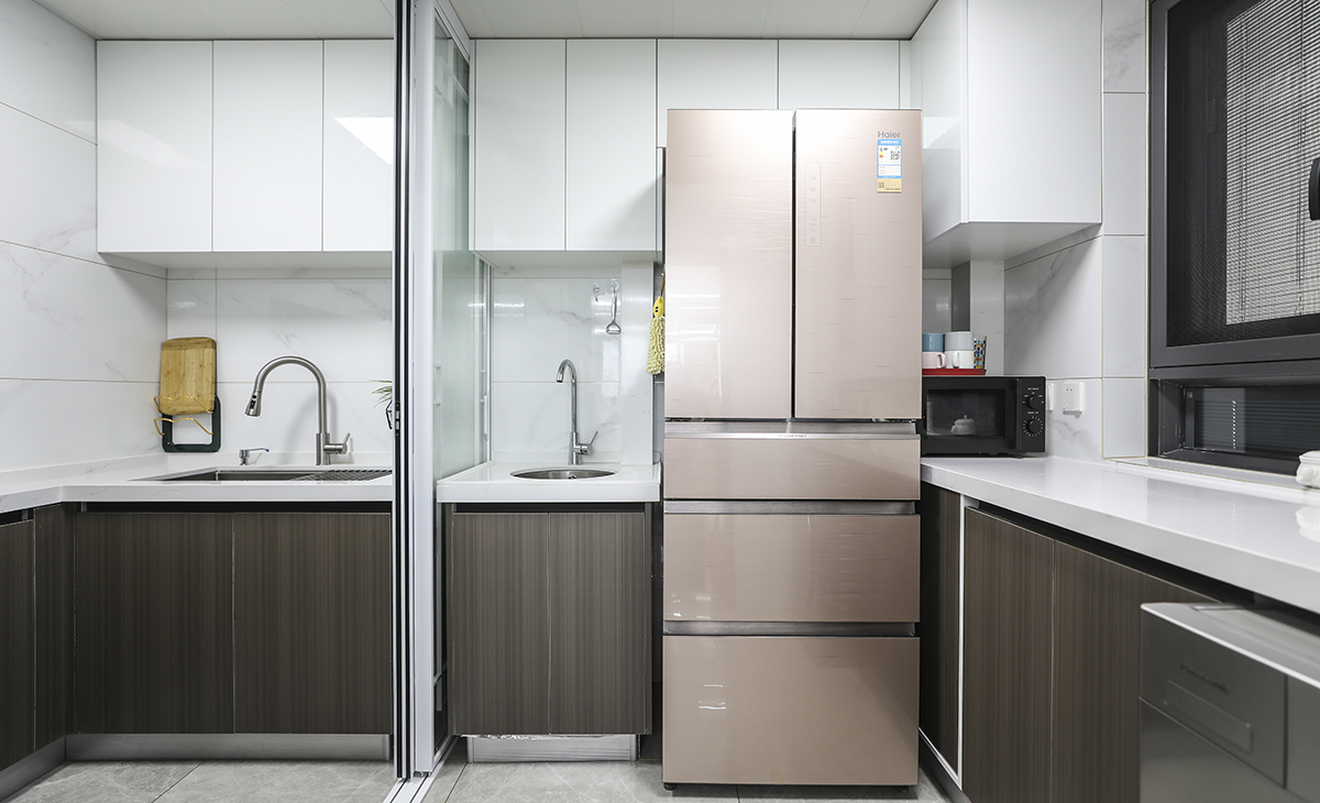 該廚房采用現代簡約風格,灰色與白色基調搭配黑色家電,展現高雅品味。特別的是,玻璃門隔斷巧妙地將廚房與餐廳相連,不僅增強了空間的通透感,還大幅提升了家居的光亮度,讓小戶型更顯寬敞明亮。