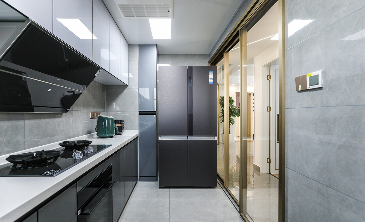 該廚房灰色與白色的基調搭配黑色家電,營造出一種清新而不失高級感的空間氛圍。玻璃門隔斷有效提升空間的通透性和光線感。玻璃門不僅能夠模糊室內外界限,引入更多自然光,使廚房顯得更加明亮寬敞,還能在小戶型中創造出更加開放、流動的視覺效果,增強整體的居住舒適度。