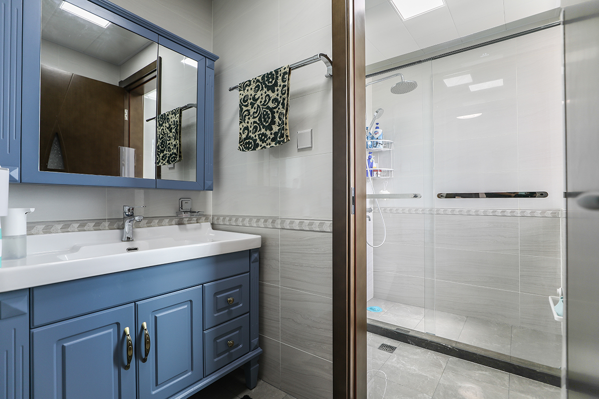 這款浴室藍色木質櫥柜作為視覺焦點,不僅增添了空間的溫馨感,還通過其獨特的色彩與白色洗手盆形成鮮明對比,增強了整體的層次感。玻璃淋浴間的設計則保持了空間的通透感,同時確保了干濕分離,提升了使用的便利性。