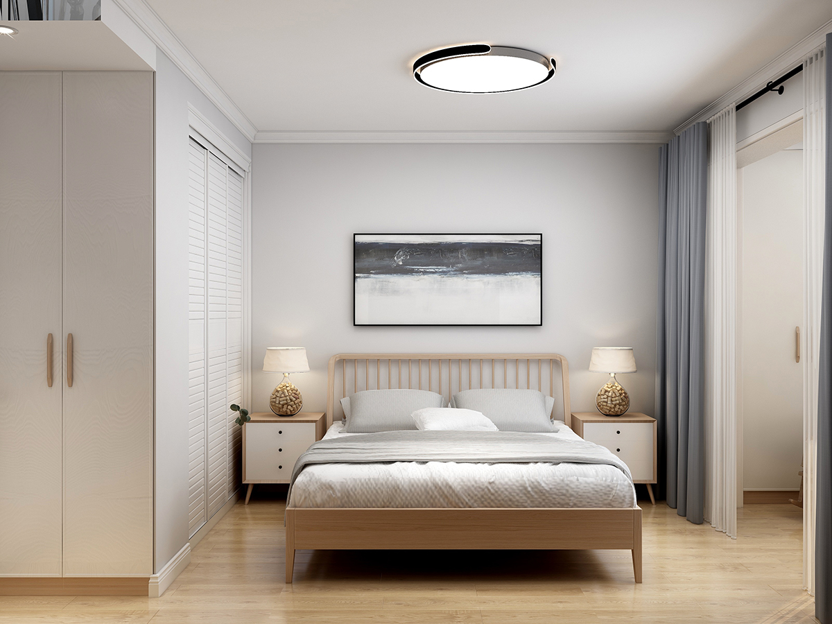 此臥室白色床品與淺色木地板相映成趣,增添空間明亮感。木質(zhì)床頭柜與整體木色元素和諧統(tǒng)一,細(xì)節(jié)之處彰顯自然質(zhì)樸之美。大型衣柜簡(jiǎn)潔線條,滿(mǎn)足收納需求同時(shí)不失美觀。抽象藝術(shù)畫(huà)作與圓形吊燈成為視覺(jué)焦點(diǎn),提升空間藝術(shù)氣息。