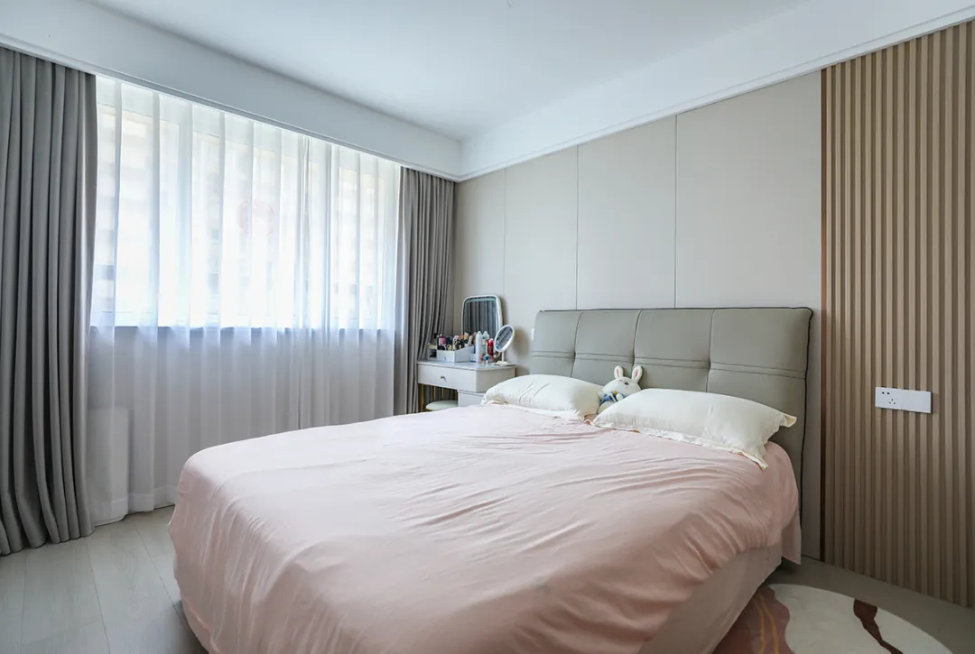 2、主臥床頭背景與客廳沙發背景材質統一,灰木紋地板和同色系床搭配,干凈簡潔。