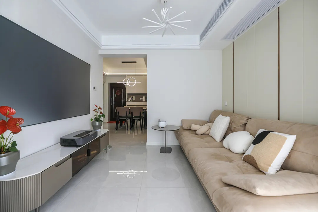 1、客廳采用簡約設計,暖色調布藝沙發,雙眼皮吊頂和線條燈增加層次和氛圍感。