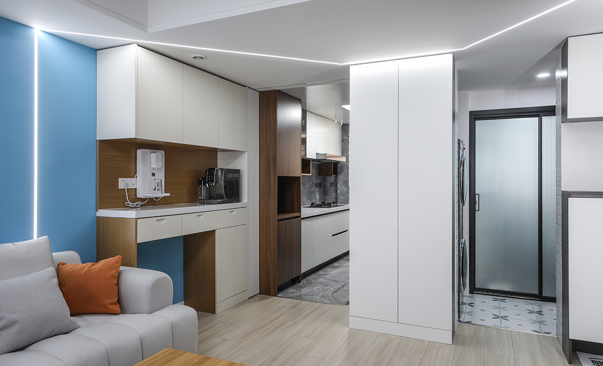 該客廳通過定制家具與空間布局,實(shí)現(xiàn)了美觀與實(shí)用的完美結(jié)合。白色與木色的基調(diào),搭配藍(lán)色墻面,營造出清新舒適的氛圍。定制柜巧妙融入廚房區(qū),不僅提供了充足的儲(chǔ)物空間,還保持了空間的整潔與開闊。