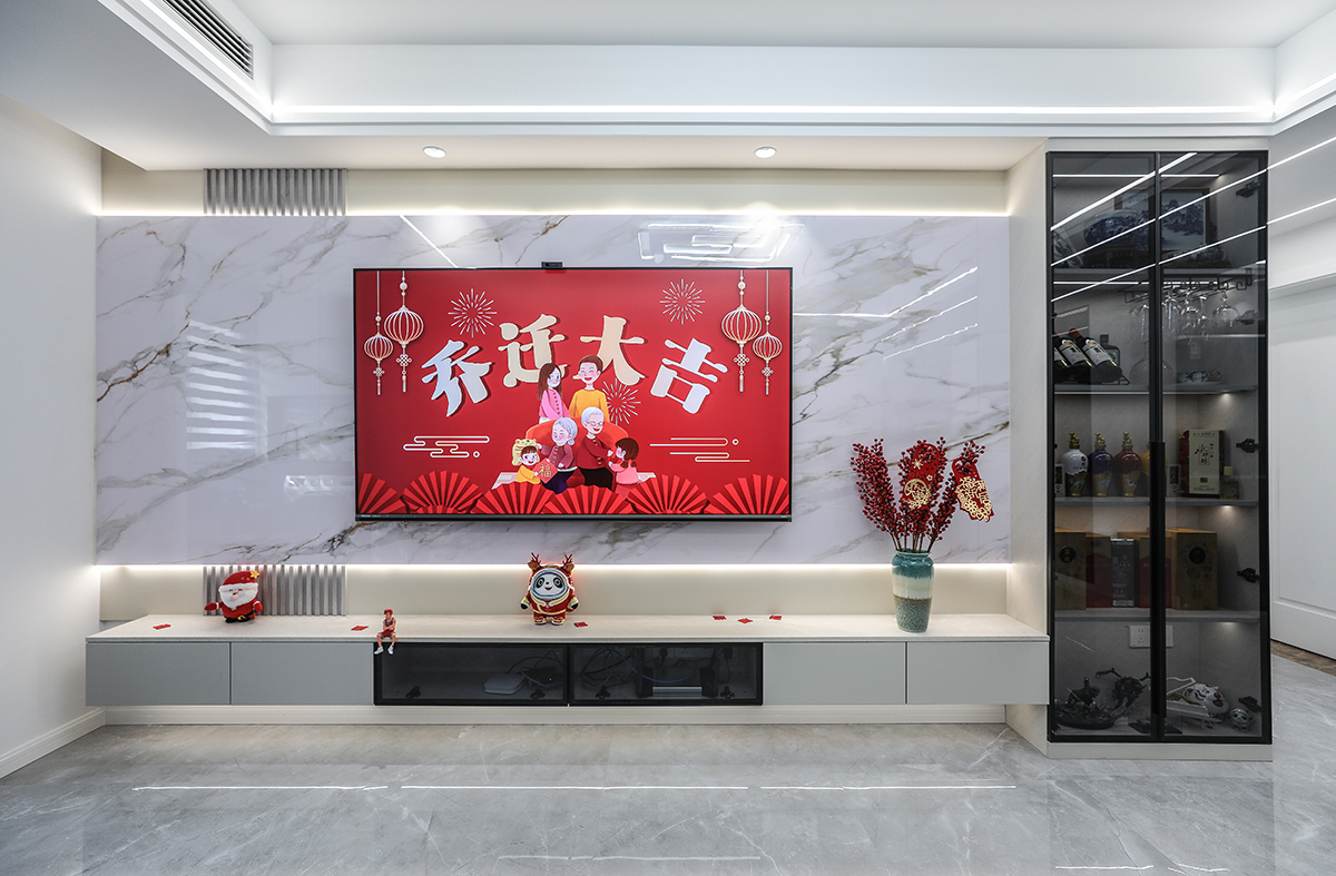 該房裝修通過定制木質(zhì)儲(chǔ)物柜與展示柜,完美融入客廳空間,既保持了視覺上的簡潔明快,又極大提升了收納效率與裝飾美感。其玻璃門設(shè)計(jì)讓藏品若隱若現(xiàn),增添客廳的藝術(shù)氛圍。