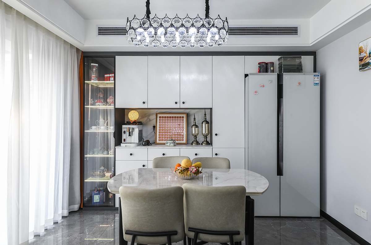該餐廳以白灰為主調,營造高雅用餐氛圍。定制玻璃門酒柜不僅是餐廳的儲物亮點,更巧妙分隔空間,增添層次感。實用而美觀,既滿足儲酒需求,又成為室內裝飾焦點。花瓶與花朵的點綴,讓每一餐都充滿生機與浪漫。