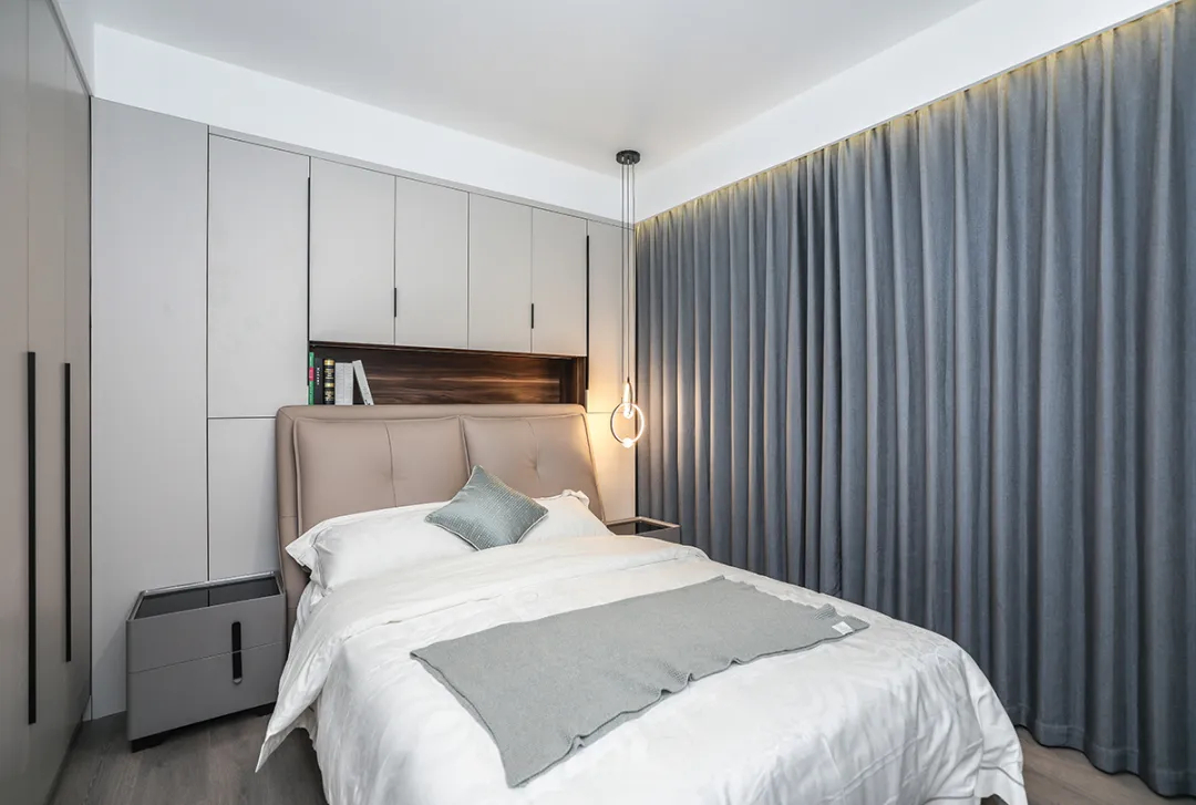本套房設計追求簡約而不簡單的設計理念,臥室以白色和灰色為主色調(diào),整個空間沒有多余的裝飾,強調(diào)線條的流暢和空間的有效利用。大面積的落地窗設計,為室內(nèi)帶來了充足的自然光線,營造出一個明亮、整潔的居住環(huán)境。