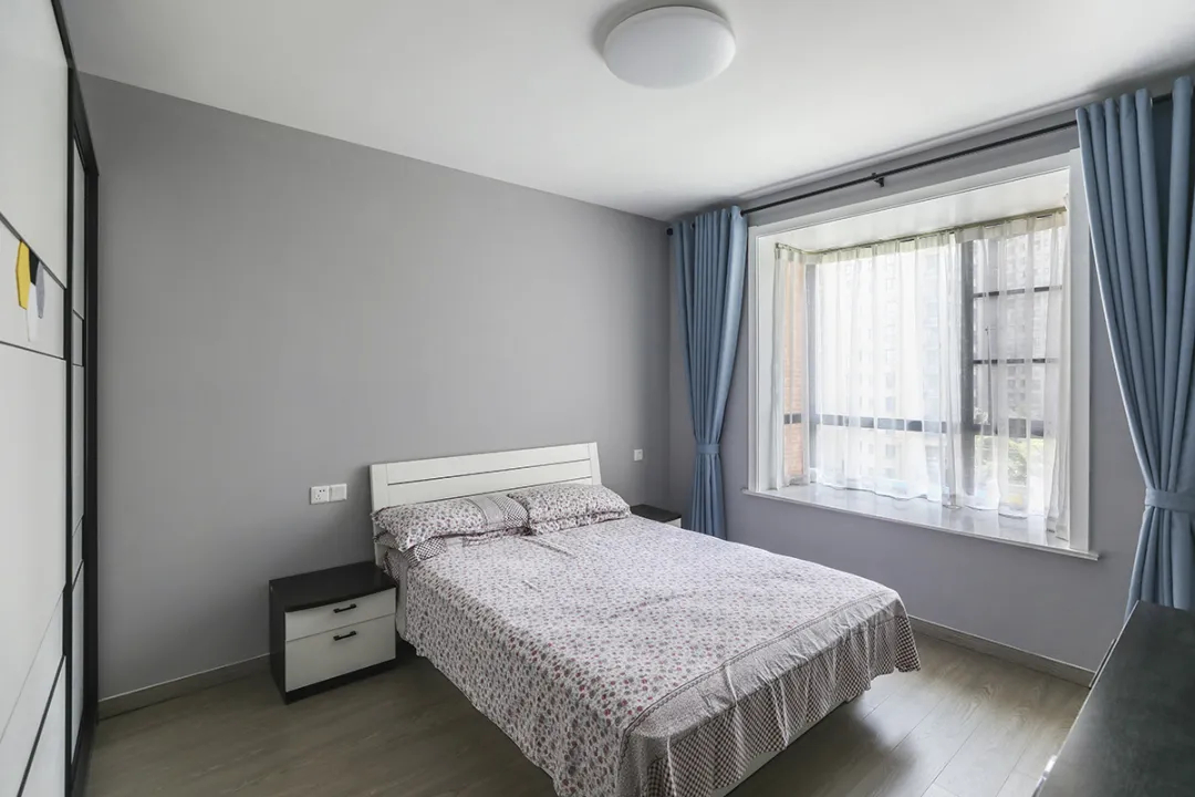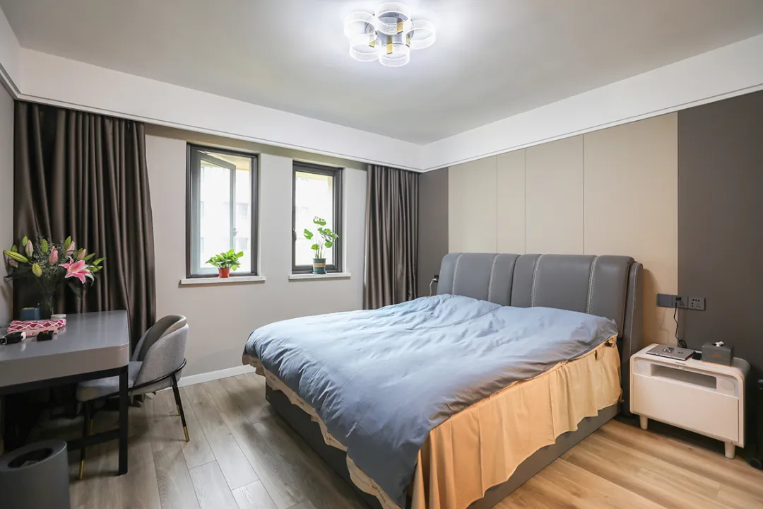 本案著重表現(xiàn)簡約風格中的“簡”字,通過淺色調(diào)的涂料和原木色地板的搭配,營造出一個自然舒適的臥室環(huán)境。軟裝方面,選擇了通頂家具和舒適的床品,使空間在保持簡約的同時,也不失溫馨和舒適感。