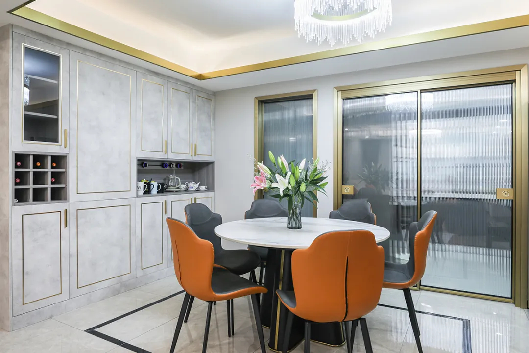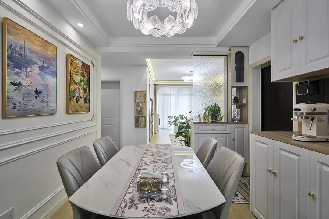 復古美式風格餐廳:將餐廳與廚房打通,增加了活動面積。餐廳與陽臺間的玻璃門設計,增加餐廳空間的光線和通透感。選擇了復古實木餐桌椅,其質感與色澤能提升家居的品質感和家的溫馨感。此外,我們還特別設立了兩個復古木色的角落柜,其設計簡潔而實用,既增加了儲物空間,也彰顯了家的精致氣息。
