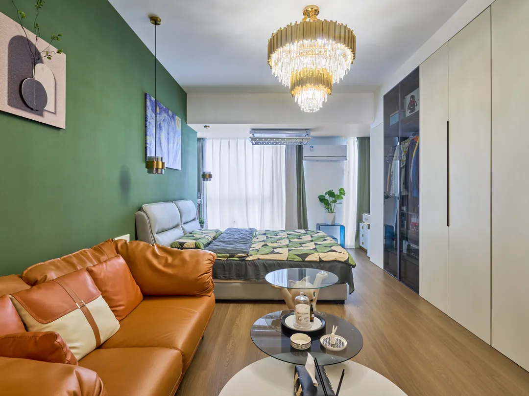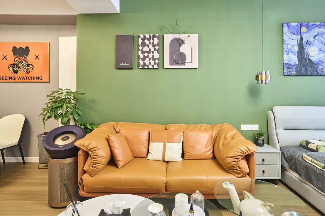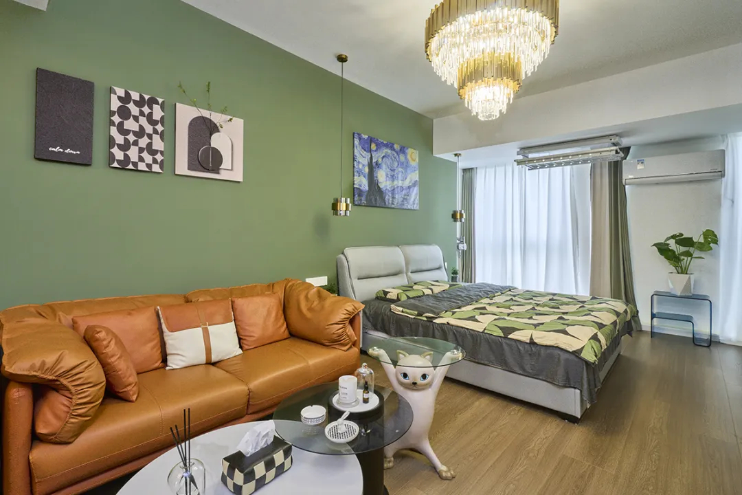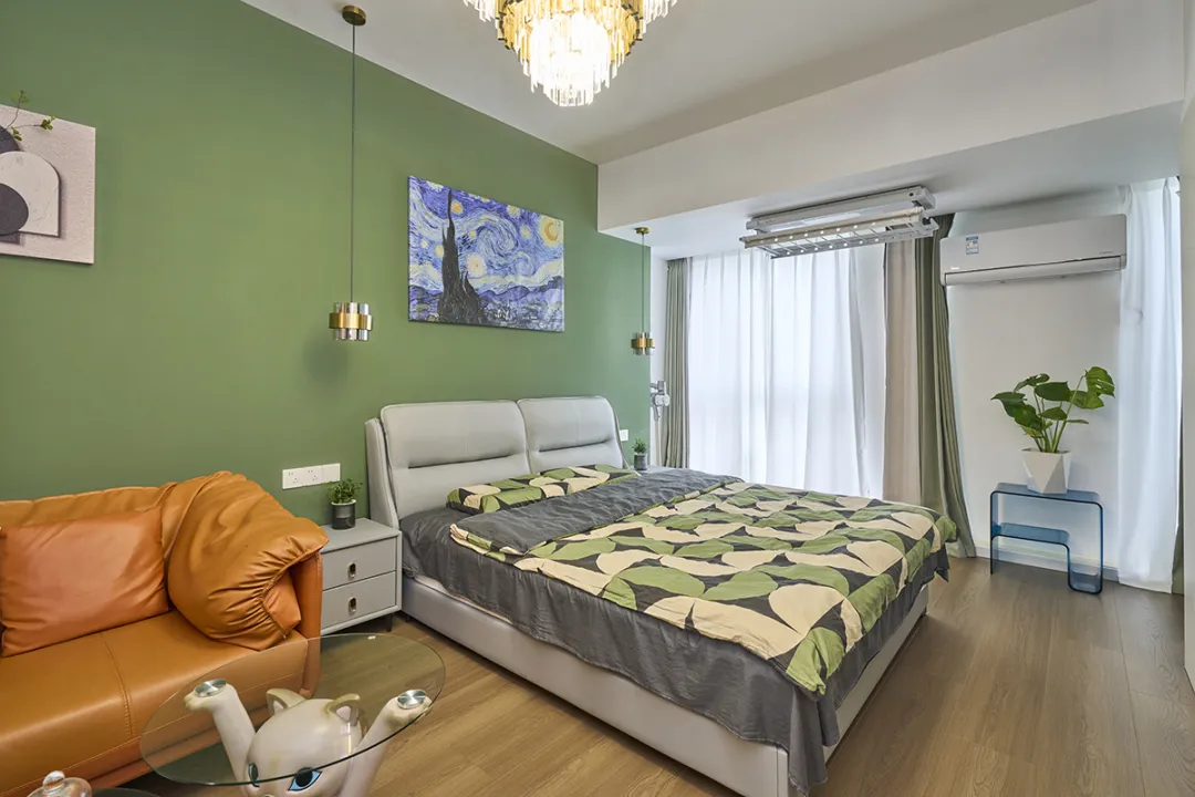睡眠區(qū)以綠色墻面和灰色皮革相呼應,為家增添了一抹活力。窗簾的設計也是一個亮點,棕色和灰色的布簾搭配白色的紗簾,讓整個空間瞬間明亮起來。