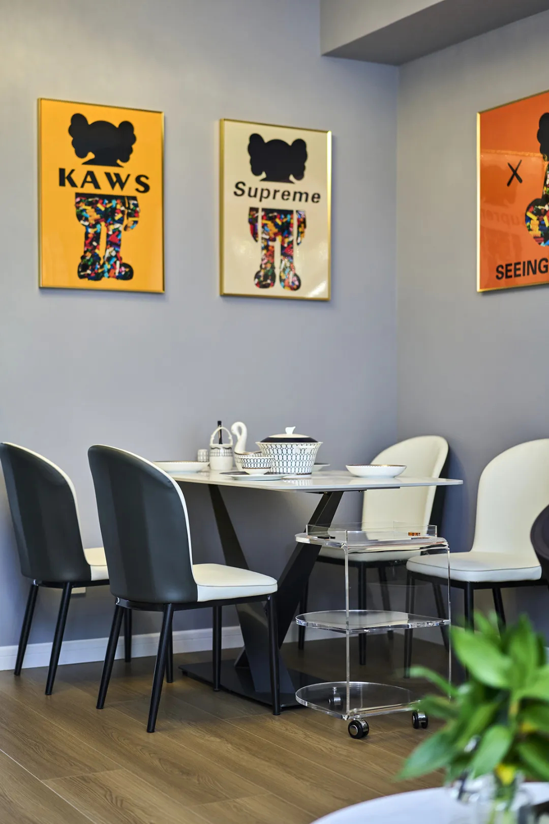 餐區(qū)采用小戶型常見的角落餐廳設計,一張簡約的餐桌搭配創(chuàng)意坐椅,既滿足了用餐需求,又不占用過多空間。墻面上的藝術裝飾和懸掛的吊燈,為這個小角落增添了一抹溫馨和個性。