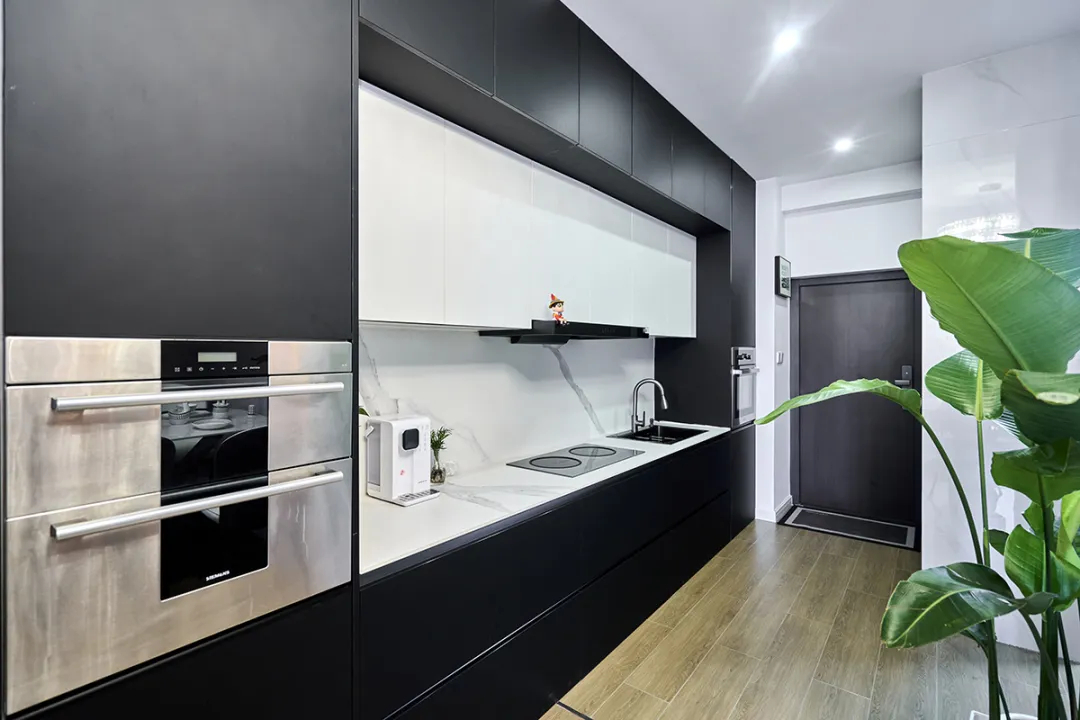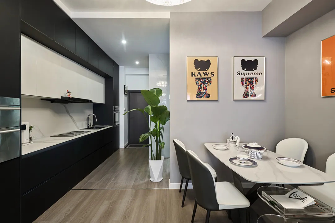 廚房區(qū)域設計成了一字型櫥柜,配備了蒸烤一體機,上柜下柜均為深灰色,與白色的吊柜和巖板臺面形成鮮明對比,大氣而不失精致。
