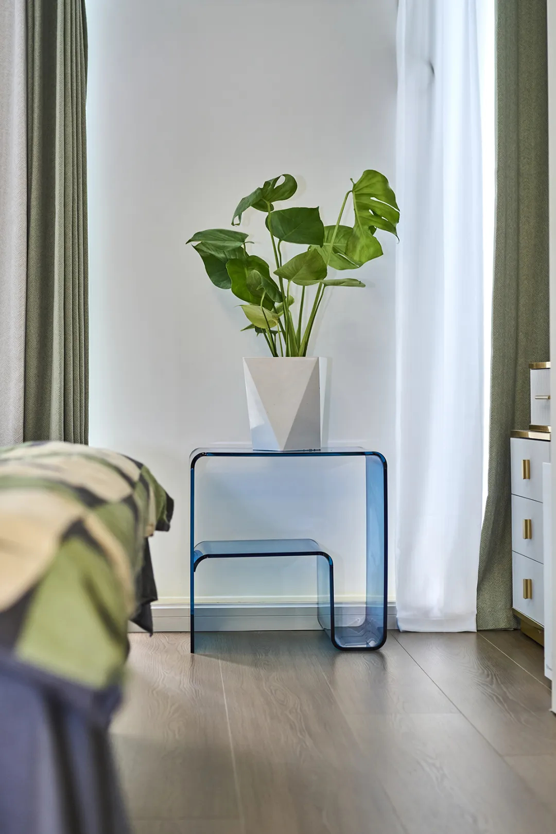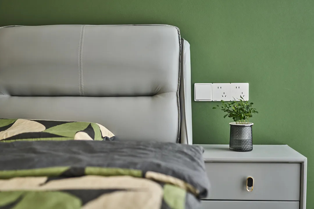 我們還通過軟裝的精心搭配,來提升小空間的高級感。如灰色床頭板與綠色床品的撞色設計,以及床頭柜上裝飾性的綠植,通過裝修細節(jié)增添空間的現(xiàn)代氣息。