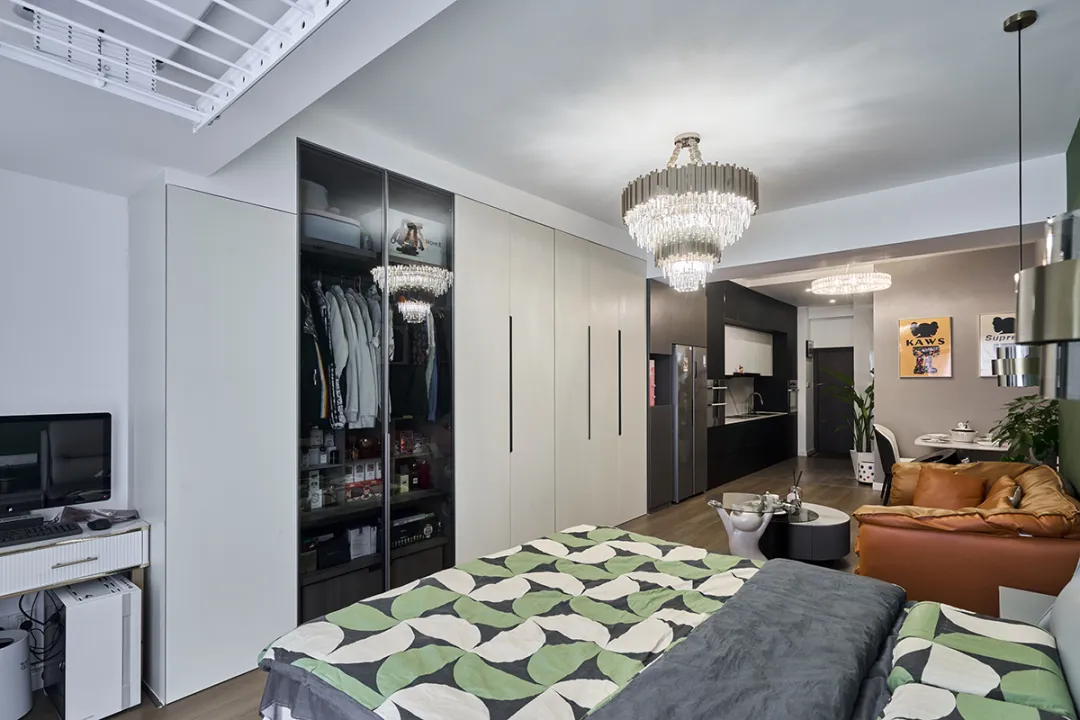 床前一米空間,我們特別定制了組合衣柜,衣柜設計玻璃開門,既顯時尚又能滿足“小更衣房”需求。這樣的設計不僅提升了空間的利用率,也為宅主提供了一個私密而實用的更衣空間。