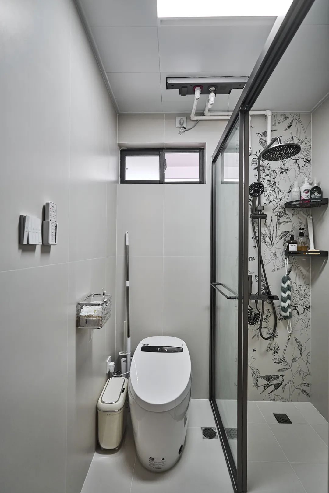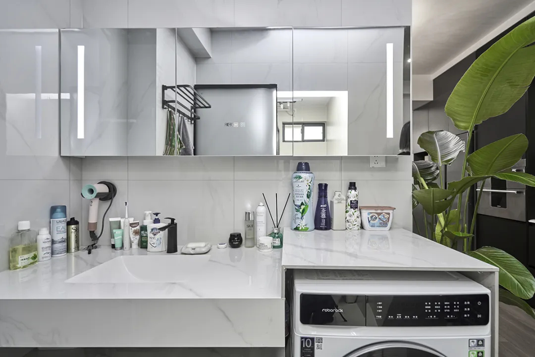 洗手臺根據(jù)客戶原有洗衣機高度和宅主生活習慣,采用高低臺設計,既符合人體工程學,又能定制化空間,讓空間干凈整潔。濕區(qū)采用槍灰色邊框淋浴房和純色墻磚,避免過于花哨的設計,讓衛(wèi)生間顯得既現(xiàn)代又寬敞。