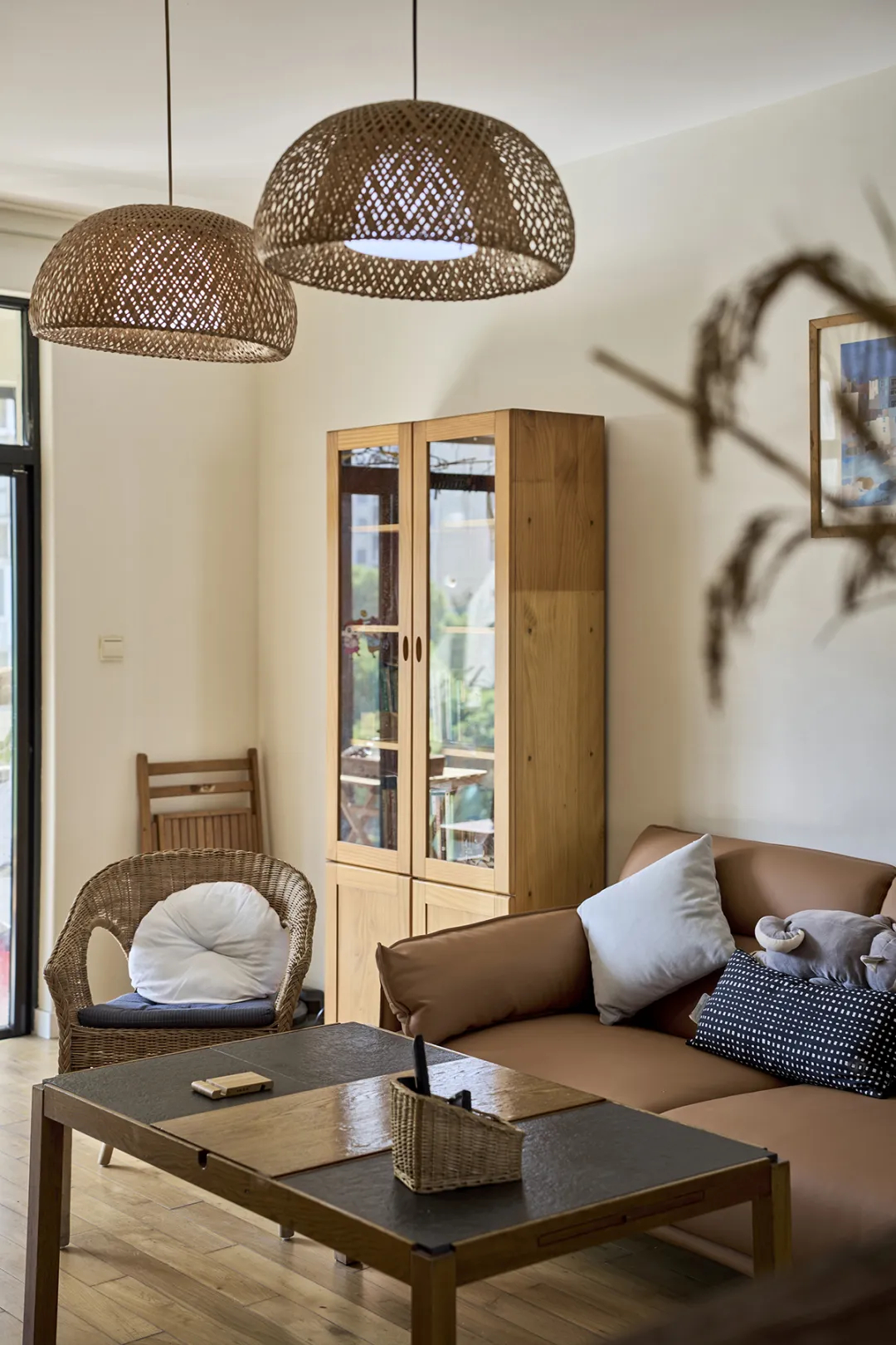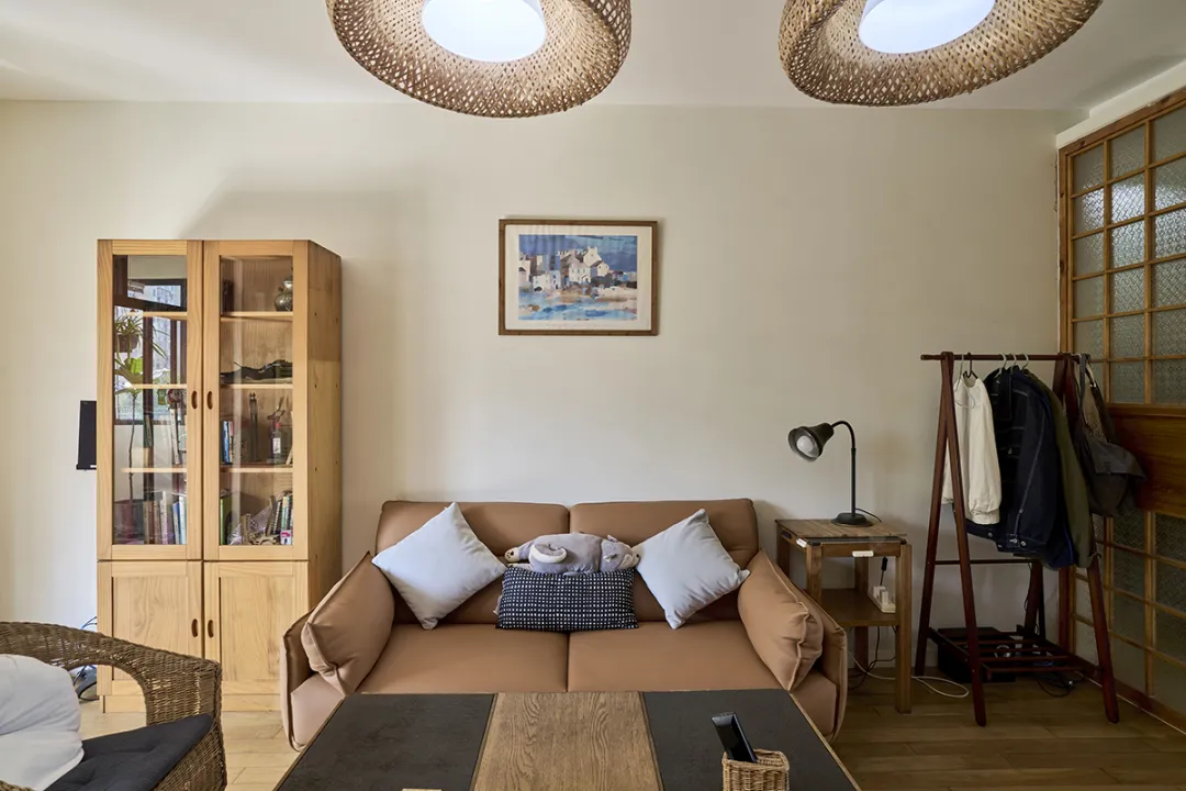 墻上的圓形竹編吊燈不僅為房間提供了柔和的照明,還增添了一抹藝術氣息。
