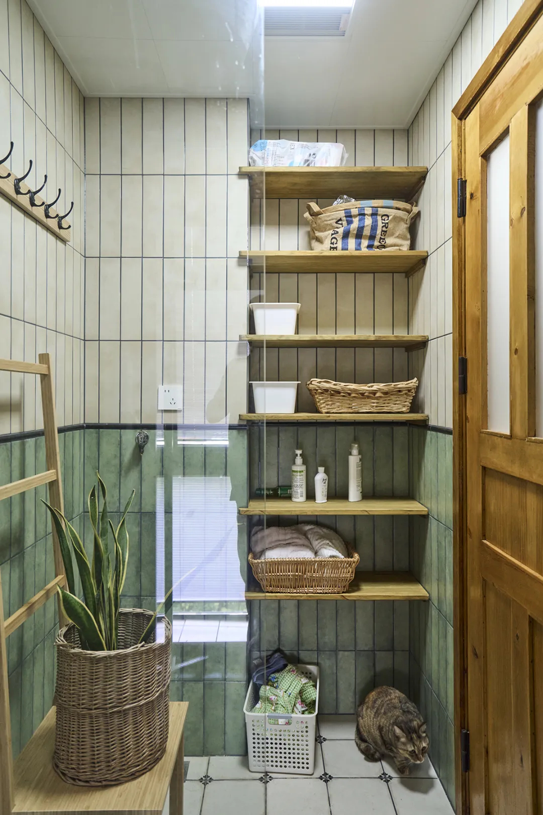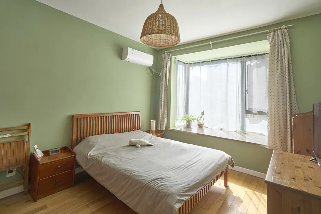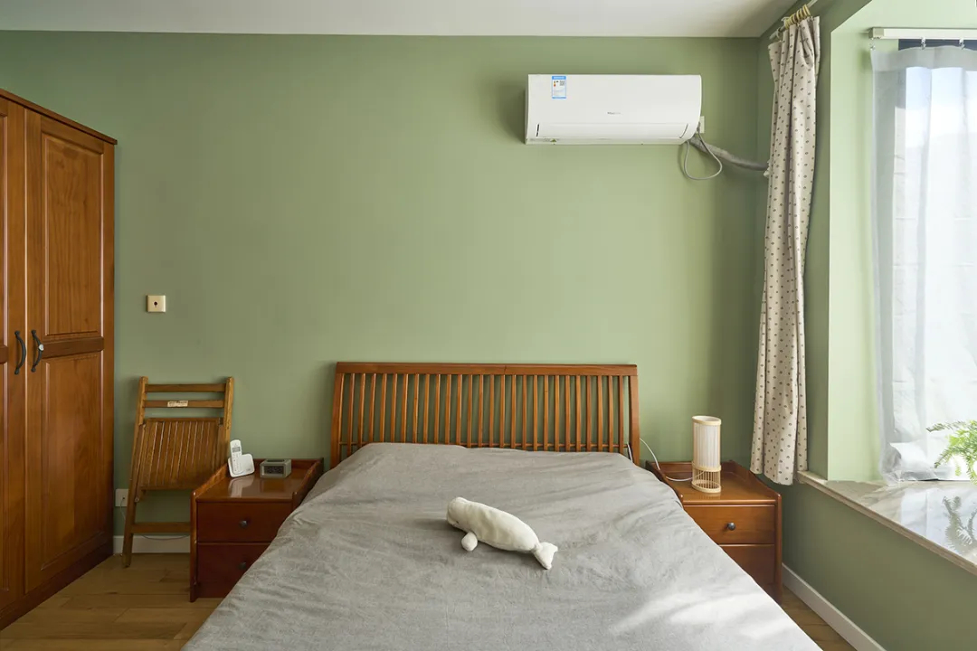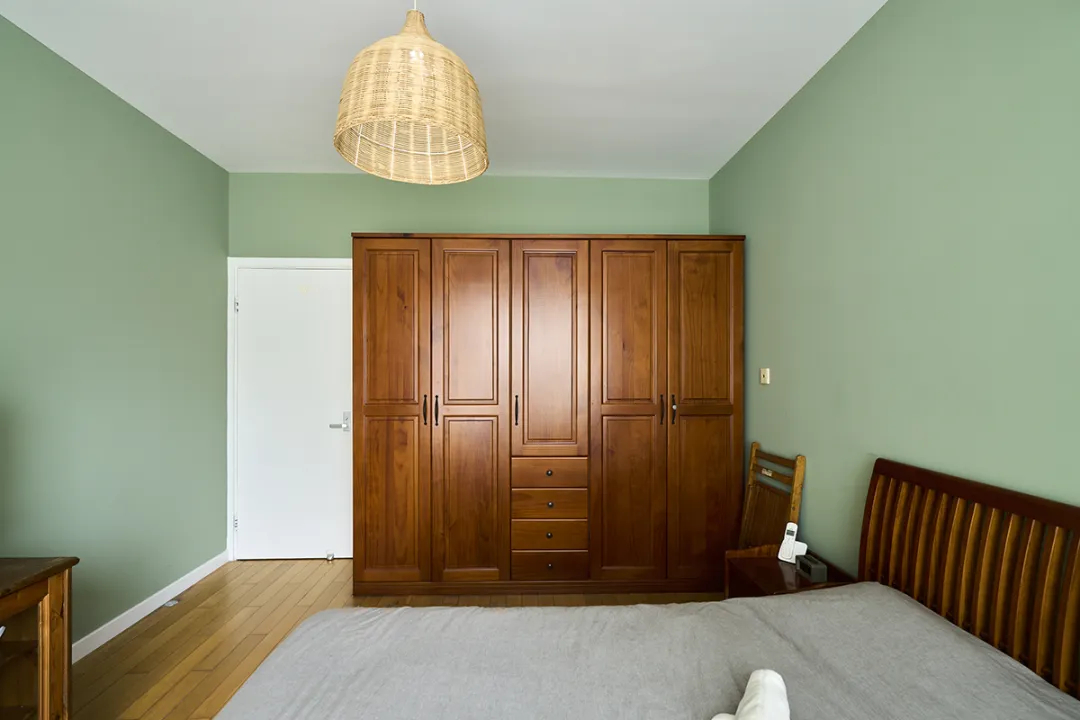 臥室以綠色墻壁和木質地板為基調,營造出一種清新自然的感覺。木質衣柜的設計簡潔大方,提供了充足的儲物空間。