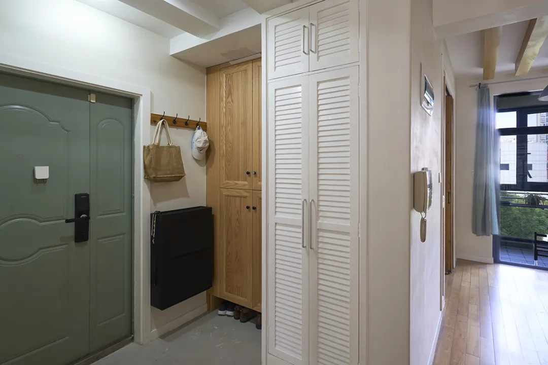 進門玄關處做簡約定制柜,不僅滿足了日常存放鞋子的需求,還在設計上也融入了整體風格,沒有破壞走廊的整體美感。灰色的地磚則與白色墻面形成了對比,增加了空間的立體感。