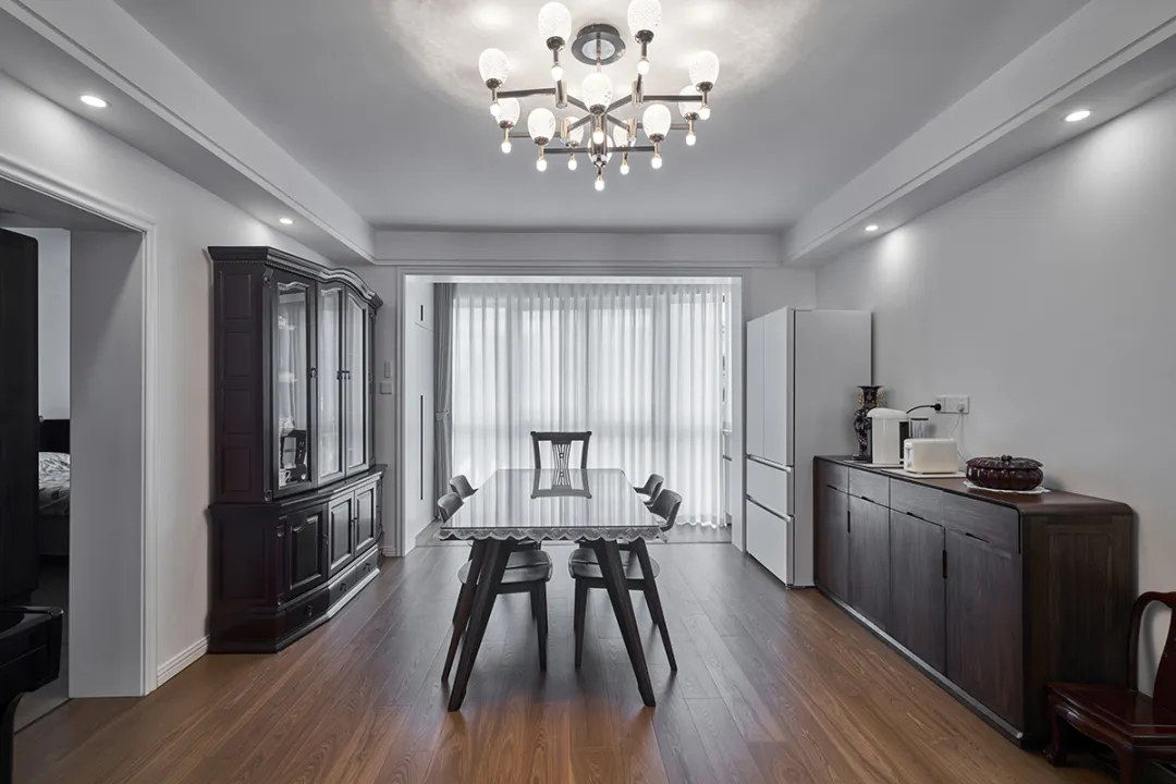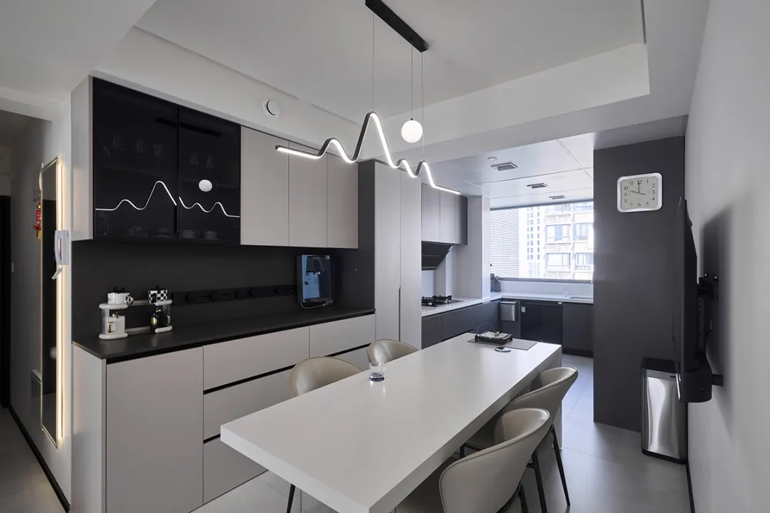 餐廳空間比較方正,整面餐邊柜和餐桌顏色呼應,黑色極窄邊框玻璃門增添了夢幻感,頂面曲線吊燈成為空間的亮點。
